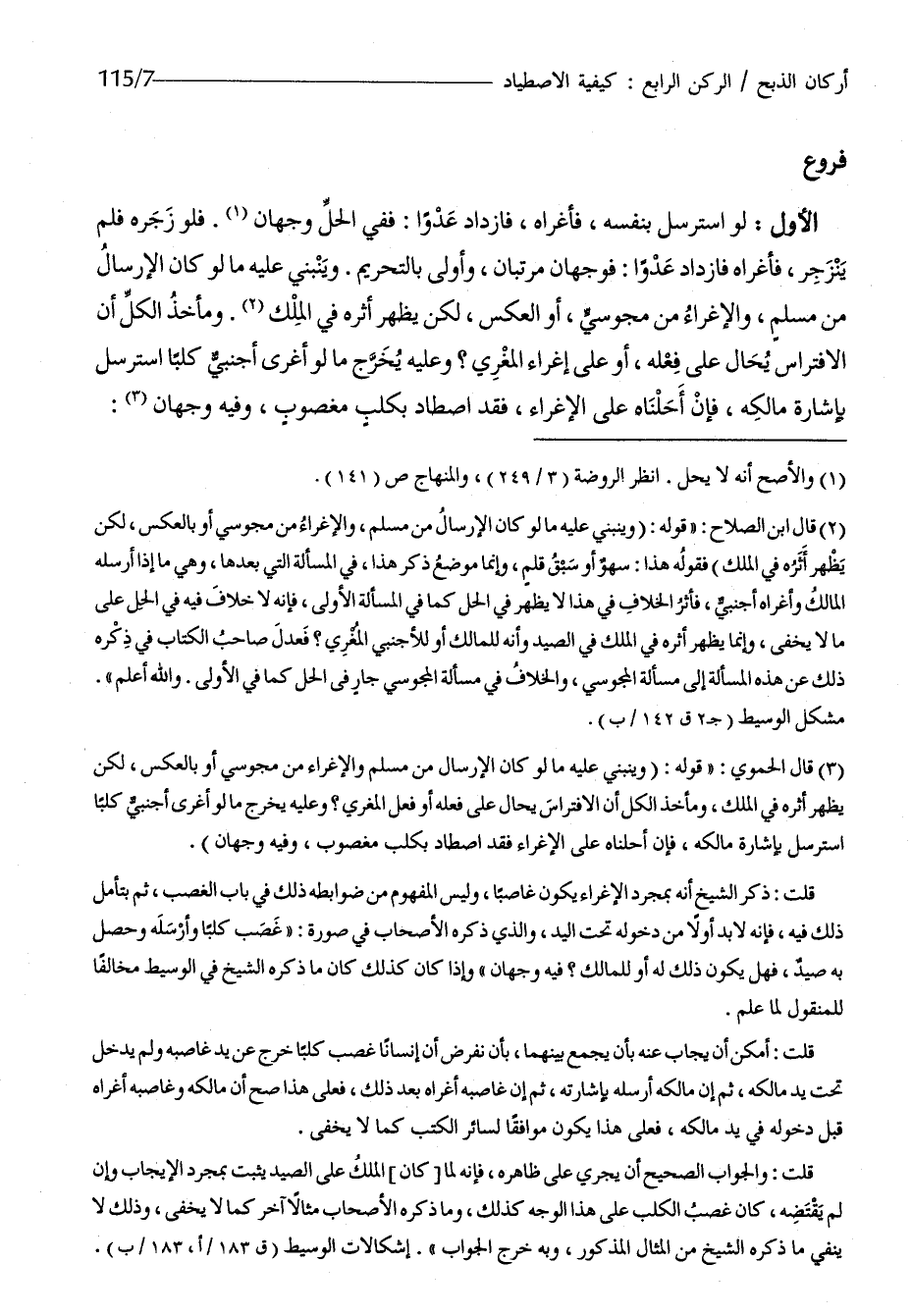 الأول لَو استرسل بِنَفسِهِ فأغراه فازداد عدوا فَفِي الْحل وَجْهَان فَلَو زَجره فَلم ينزجر فأغراه فازداد عدوا فَوَجْهَانِ مرتبان وَأولى بِالتَّحْرِيمِ وَيَنْبَنِي عَلَيْهِ مَا لَو كَانَ الْإِرْسَال من مُسلم والإغراء من مَجُوسِيّ أَو الْعَكْس لَكِن يظْهر أَثَره فِي الْملك ومأخذ الْكل أَن الإفتراس يُحَال على فعله أَو على اغراء المغري وَعَلِيهِ يخرج مَا لَو أغرى أَجْنَبِي كَلْبا استرسل بِإِشَارَة مَالِكه فَإِن أحلناه على الإغراء فقد اصطاد بكلب مَغْصُوب وَفِيه وَجْهَان