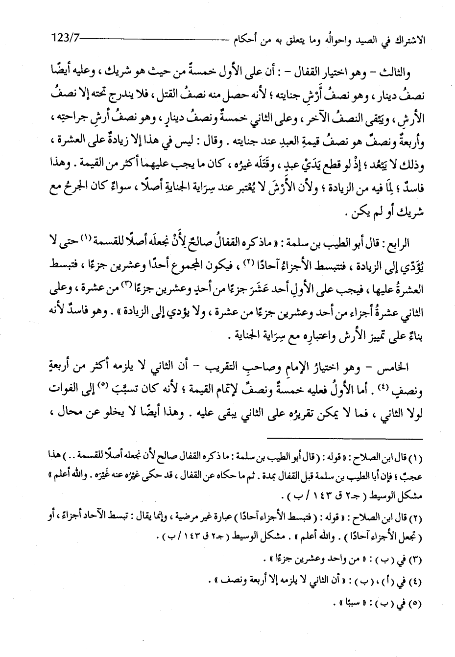 الرَّابِع قَالَ أَبُو الطّيب بن سَلمَة مَا ذكره الْقفال صَالح لِأَن نجعله أصلا للْقِسْمَة حَتَّى لَا يُؤَدِّي إِلَى الزِّيَادَة فتتبسط الْأَجْزَاء آحادا فَيكون الْمَجْمُوع أحدا وَعشْرين جُزْءا فتبسط الْعشْرَة عَلَيْهَا فَيجب على الأول أحد عشر جُزْءا من أحد وَعشْرين جُزْءا من عشرَة وعَلى الثَّانِي عشرَة أَجزَاء من أحد وَعشْرين جُزْءا من عشرَة وَلَا يُؤَدِّي إِلَى الزِّيَادَة وَهُوَ فَاسد لِأَنَّهُ بِنَاء على تَمْيِيز الْأَرْش واعتباره مَعَ سرَايَة الْجِنَايَة
