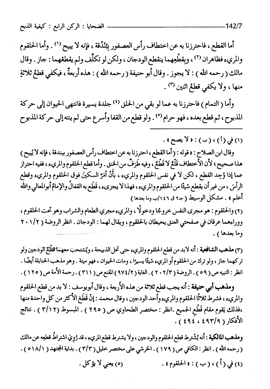 أما الْقطع فاحترزنا بِهِ عَن اختطاف رَأس العصفور ببندقة فَإِنَّهُ لَا يُبِيح وَأما الْحُلْقُوم والمريء فظاهران وبقطعهما يَنْقَطِع الودجان وَلَكِن لَو تكلّف وَلم يقطعهما جَازَ وَقَالَ مَالك رَحمَه الله لَا يجوز وَقَالَ أَبُو حنيفَة رَحمَه الله هَذِه أَرْبَعَة فَيَكْفِي قطع ثَلَاثَة مِنْهَا وَلَا يَكْفِي قطع اثْنَيْنِ