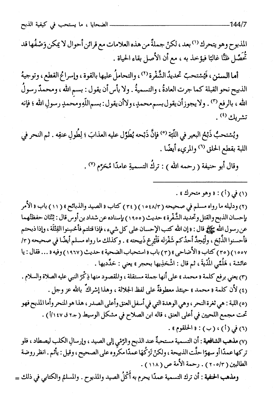 أما السّنَن فَيُسْتَحَب تَحْدِيد الشَّفْرَة والتحامل عَلَيْهَا بِالْقُوَّةِ وإسراع الْقطع وتوجيه الذَّبِيح نَحْو الْقبْلَة كَمَا جرت الْعَادة وَالتَّسْمِيَة وَلَا بَأْس أَن يَقُول بِسم الله وَمُحَمّد رَسُول الله بِالرَّفْع وَلَا يجوز أَن يَقُول بِسم مُحَمَّد وَلَا أَن يَقُول بِسم الله وَمُحَمّد رَسُول الله فَإِنَّهُ تشريك وَيسْتَحب ذبح الْبَعِير فِي اللبة فَإِن ذبحه يطول عَلَيْهِ الْعَذَاب لطول عُنُقه ثمَّ النَّحْر فِي اللبة بِقطع الْحلق والمريء أَيْضا وَقَالَ أَبُو حنيفَة رَحمَه الله ترك التَّسْمِيَة عَامِدًا محرم