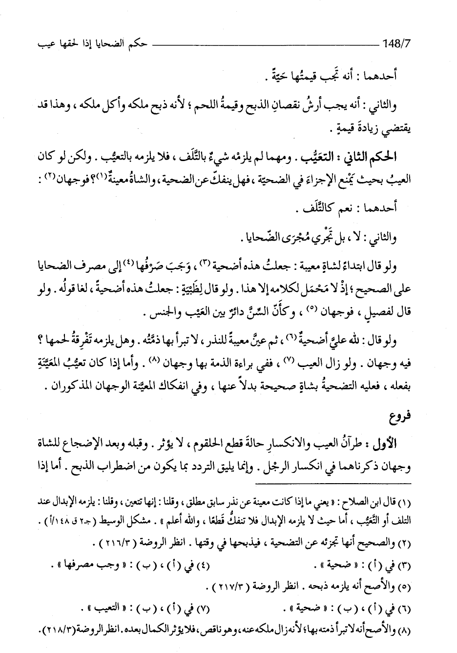 الحكم الثَّانِي التعيب وَمهما لم يلْزمه شَيْء بالتلف فَلَا يلْزمه بالتعيب وَلَكِن لَو كَانَ الْعَيْب بِحَيْثُ يمْنَع الْإِجْزَاء فِي الضحية فَهَل يَنْفَكّ عَن الضحية وَالشَّاة مُعينَة فَوَجْهَانِ أَحدهمَا نعم كالتلف وَالثَّانِي لَا بل تجْرِي مجْرى الضَّحَايَا