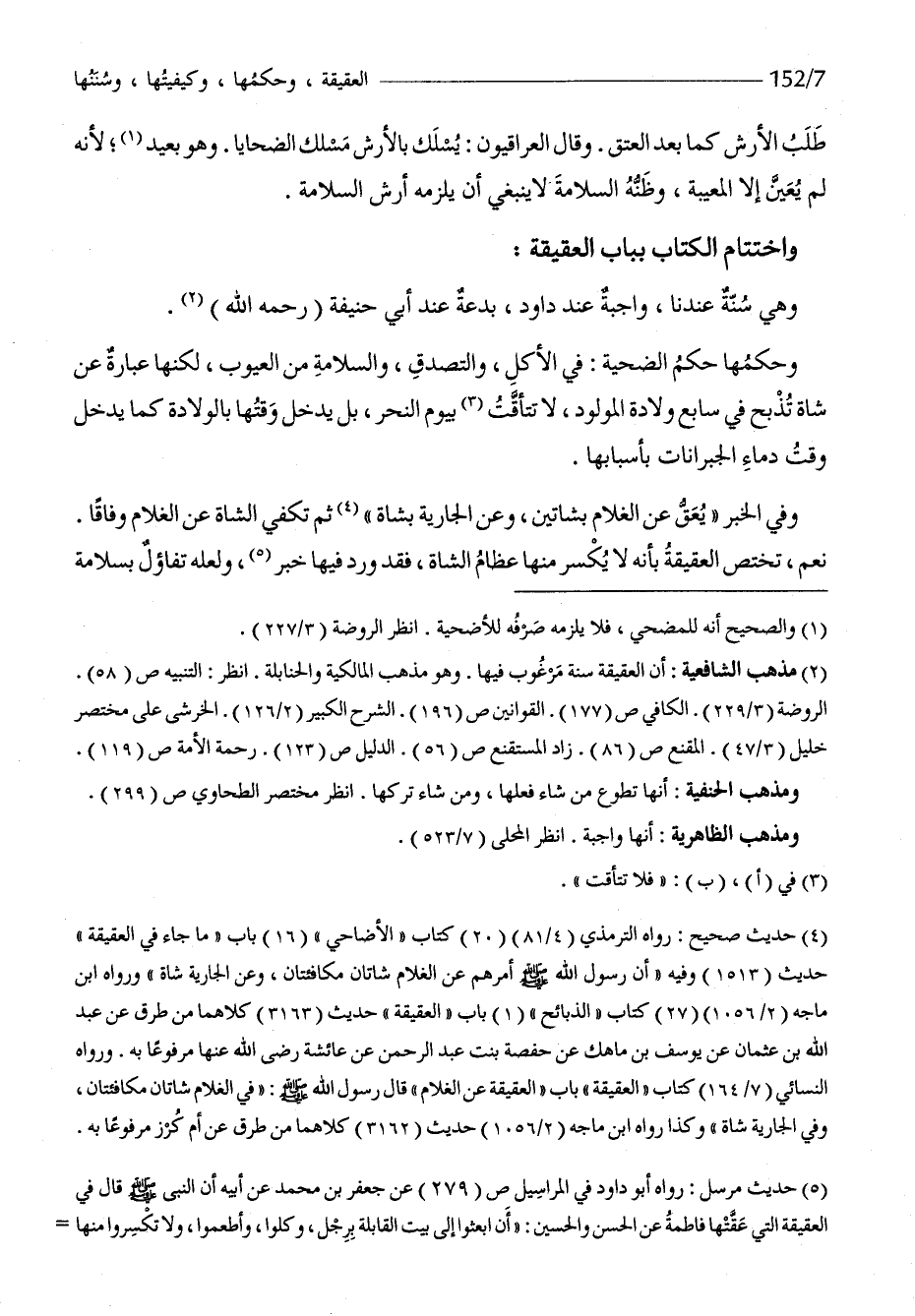 واختتام الْكتاب بِبَاب الْعَقِيقَة وَهِي سنة عندنَا وَاجِبَة عِنْد دَاوُد بِدعَة عِنْد أبي حنيفَة رَحمَه الله