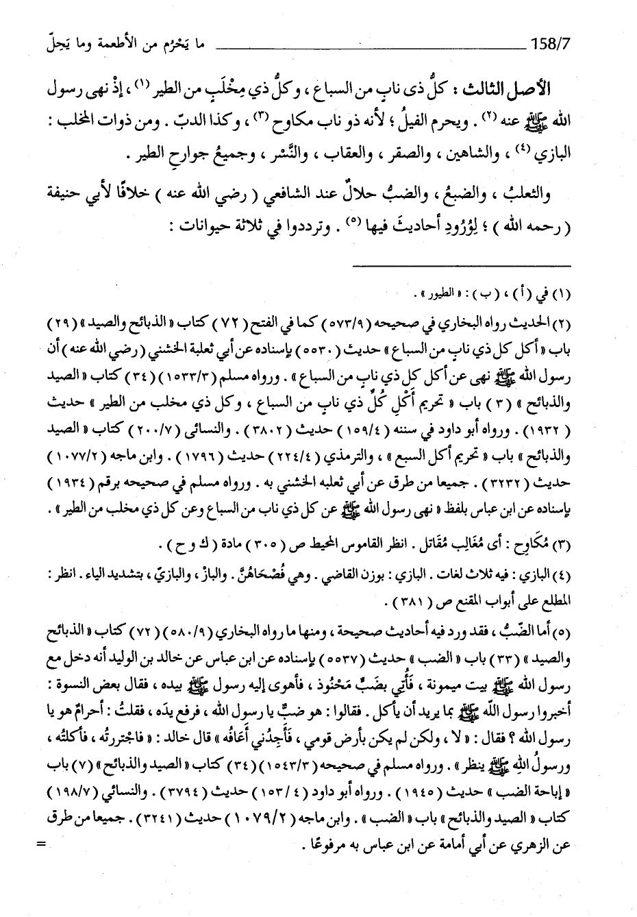 الأَصْل الثَّالِث كل ذِي نَاب من السبَاع وكل ذِي مخلب من الطير إِذْ نهى رَسُول الله صلى الله عَلَيْهِ وَسلم عَنهُ وَيحرم الْفِيل لِأَنَّهُ ذُو نَاب مكاوح وَكَذَا الدب وَمن ذَوَات المخلب الْبَازِي والشاهين والصقر وَالْعِقَاب والنسر وَجَمِيع جوارح الطير والثعلب والضبع والضب حَلَال عِنْد الشَّافِعِي رَضِي الله عَنهُ خلافًا لأبي حنيفَة رَحمَه الله لوُرُود أَحَادِيث فِيهَا وترددوا فِي ثَلَاثَة حيوانات