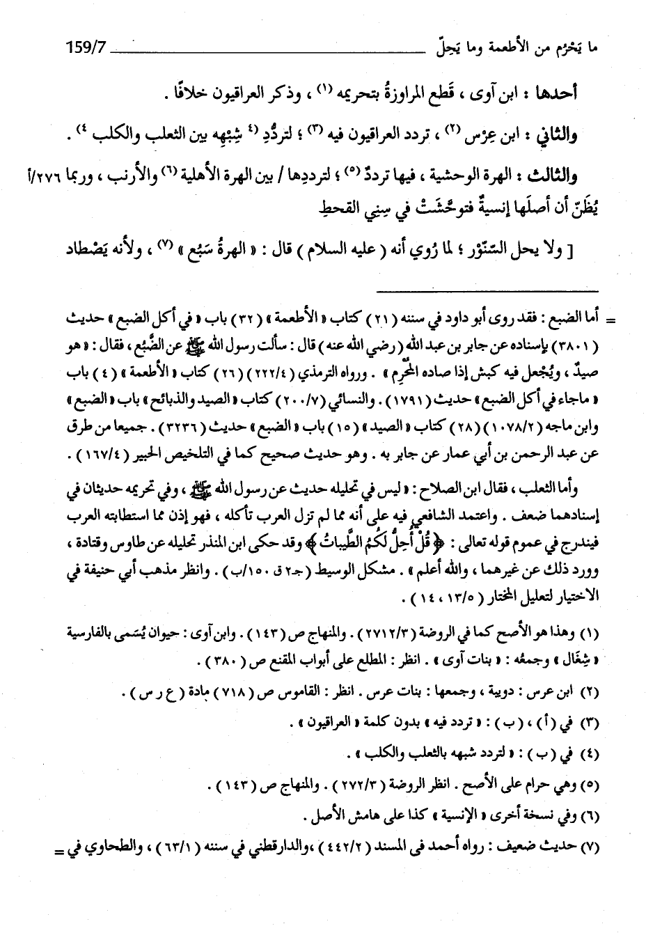 وَالثَّالِث الْهِرَّة الوحشية فِيهَا تردد لترددها بَين الْهِرَّة الْأَهْلِيَّة والأرنب وَرُبمَا يظنّ أَن أَصْلهَا إنسية فتوحشت فِي سني الْقَحْط وَلَا يحل السنور لما رُوِيَ أَنه عَلَيْهِ السَّلَام قَالَ الْهِرَّة سبع وَلِأَنَّهُ يصطاد