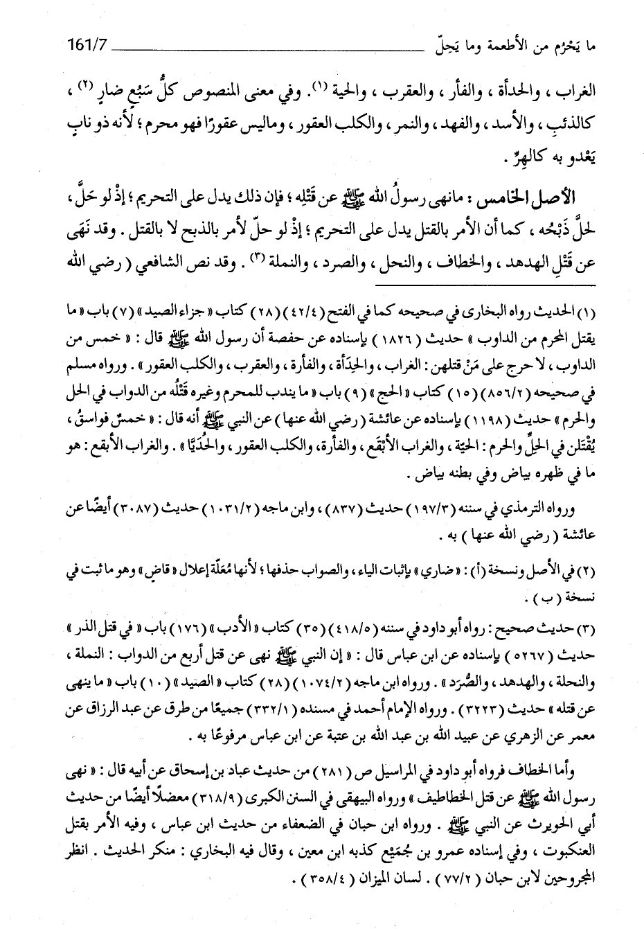 الأَصْل الخامص مَا نهى رَسُول الله صلى الله عَلَيْهِ وَسلم عَن قَتله فَإِن ذَلِك يدل على التَّحْرِيم إِذْ لَو حل لحل ذبحه كَمَا أَن الْأَمر بِالْقَتْلِ يدل على التَّحْرِيم إِذْ لَو حل لأمر بِالذبْحِ لَا بِالْقَتْلِ وَقد نهى عَن قتل الهدهد والخطاف والنحل والصرد ولنملة وَقد نَص رَضِي الله