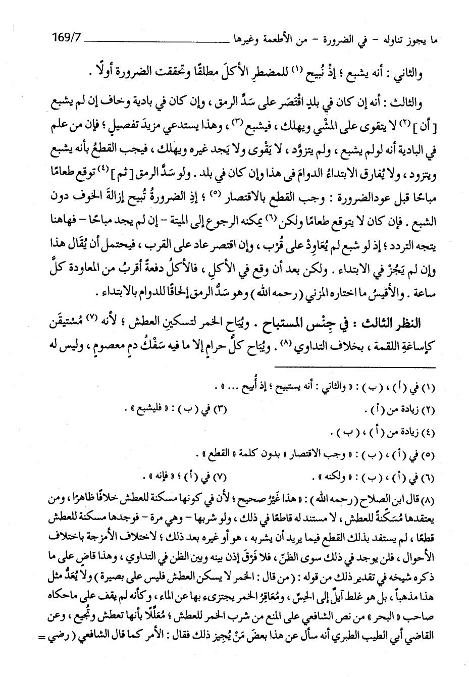النّظر الثَّالِث فِي جنس المستباح وَيُبَاح الْخمر لتسكين الْعَطش لِأَنَّهُ مستيقن كإساغة اللُّقْمَة بِخِلَاف التَّدَاوِي وَيُبَاح كل حرَام إِلَّا مَا فِيهِ سفك دم مَعْصُوم وَلَيْسَ لَهُ