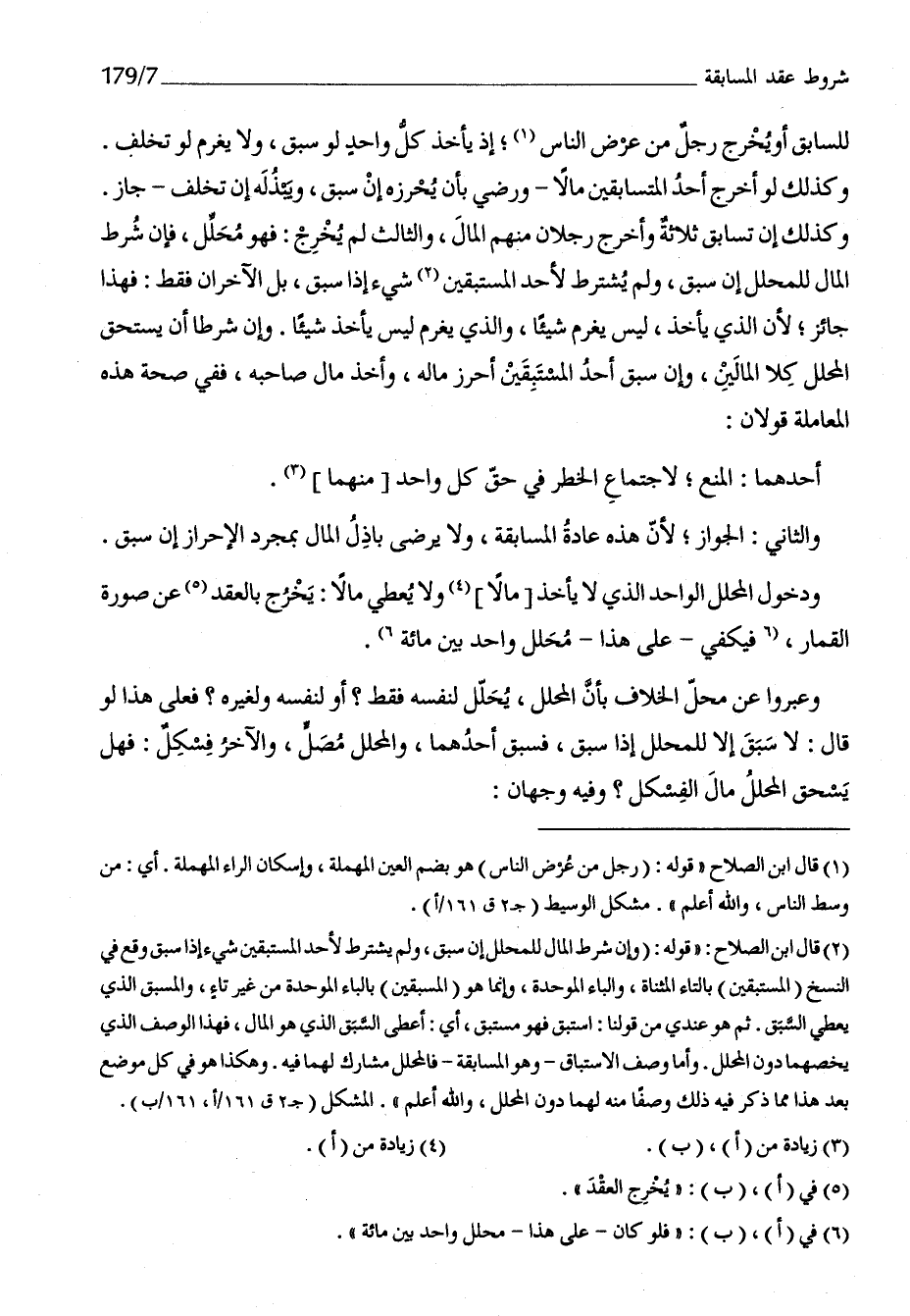 للسابق أَو يخرج رجل من عرض النَّاس إِذْ يَأْخُذ كل وَاحِد لَو سبق وَلَا يغرم لَو تخلف وَكَذَلِكَ لَو أخرج أحد المتسابقين مَالا وَرَضي بِأَن يحرزه إِن سبق ويبذله إِن تخلف جَازَ وَكَذَلِكَ إِن تسابق ثَلَاثَة وَأخرج رجلَانِ مِنْهُم المَال وَالثَّالِث لم يخرج فَهُوَ مُحَلل فَإِن شَرط المَال للمحلل إِن سبق وَلم يشْتَرط لأحد المستبقين شَيْء إِذا سبق بل الْآخرَانِ فَقَط فَهَذَا جَائِز لِأَن الَّذِي يَأْخُذ لَيْسَ يغرم شَيْئا وَالَّذِي يغرم لَيْسَ يَأْخُذ شَيْئا وَإِن شرطا أَن يسْتَحق الْمُحَلّل كلا الْمَالَيْنِ وَإِن سبق أحد المستبقين أحرز مَاله وَأخذ مَال صَاحبه فَفِي صِحَة هَذِه الْمُعَامَلَة قَولَانِ أَحدهمَا الْمَنْع لِاجْتِمَاع الْخطر فِي حق كل وَاحِد مِنْهُمَا وَالثَّانِي الْجَوَاز لِأَن هَذِه عَادَة الْمُسَابقَة وَلَا يرضى باذل المَال بِمُجَرَّد الْإِحْرَاز إِن سبق