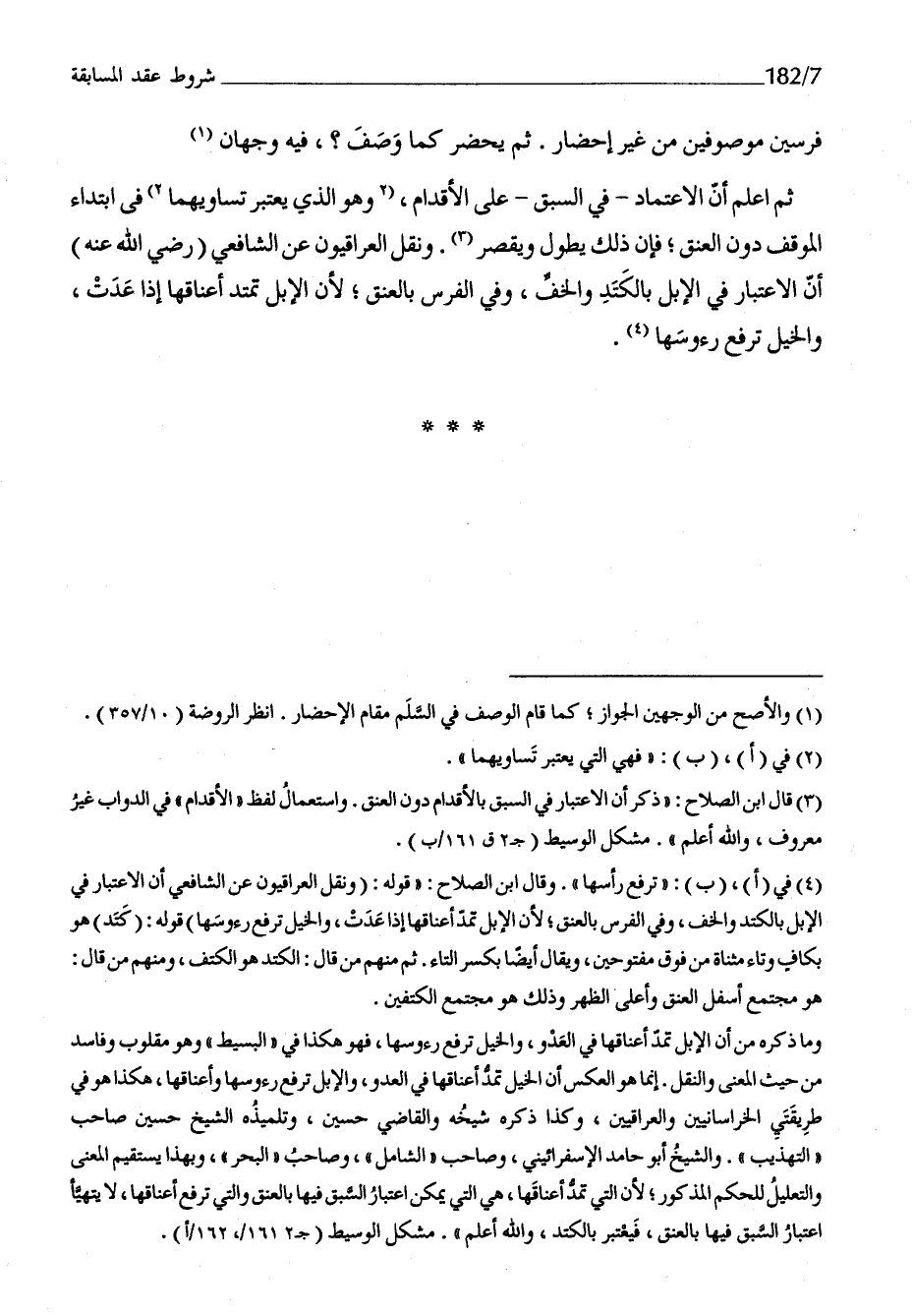 ثمَّ اعْلَم أَن الإعتماد فِي السَّبق على الْأَقْدَام وَهُوَ الَّذِي يعْتَبر تساويهما فِي ابْتِدَاء الْموقف دون الْعُنُق فَإِن ذَلِك يطول وَيقصر وَنقل الْعِرَاقِيُّونَ عَن الشَّافِعِي رَضِي الله عَنهُ أَن الإعتبار فِي الْإِبِل بالكتد والخف وَفِي الْفرس بالعنق لِأَن الْإِبِل تمتد أعناقها إِذا عدت وَالْخَيْل ترفع رءوسها