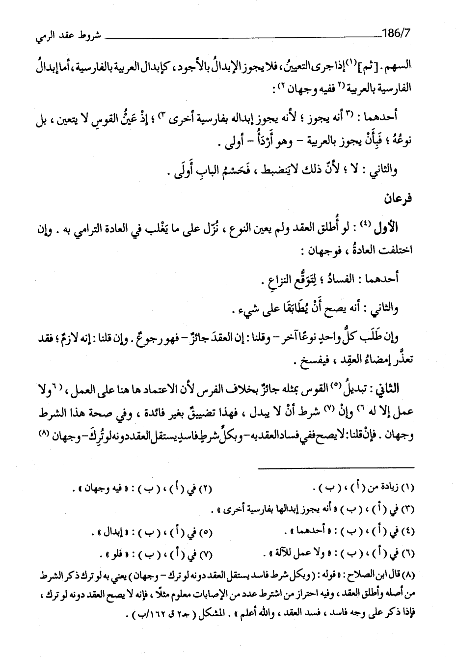 السهْم ثمَّ إِذا جرى التَّعْيِين فَلَا يجوز الْإِبْدَال بالأجود كإبدال الْعَرَبيَّة بِالْفَارِسِيَّةِ أما إِبْدَال الفارسية بِالْعَرَبِيَّةِ فَفِيهِ وَجْهَان أَحدهمَا أَنه يجوز لِأَنَّهُ يجوز إِبْدَاله بفارسية أُخْرَى إِذْ عين الْقوس لَا يتَعَيَّن بل نَوعه فبأن يجوز بِالْعَرَبِيَّةِ وَهُوَ أردأ أولى وَالثَّانِي لَا لِأَن ذَلِك لَا يَنْضَبِط فحسم الْبَاب أولى