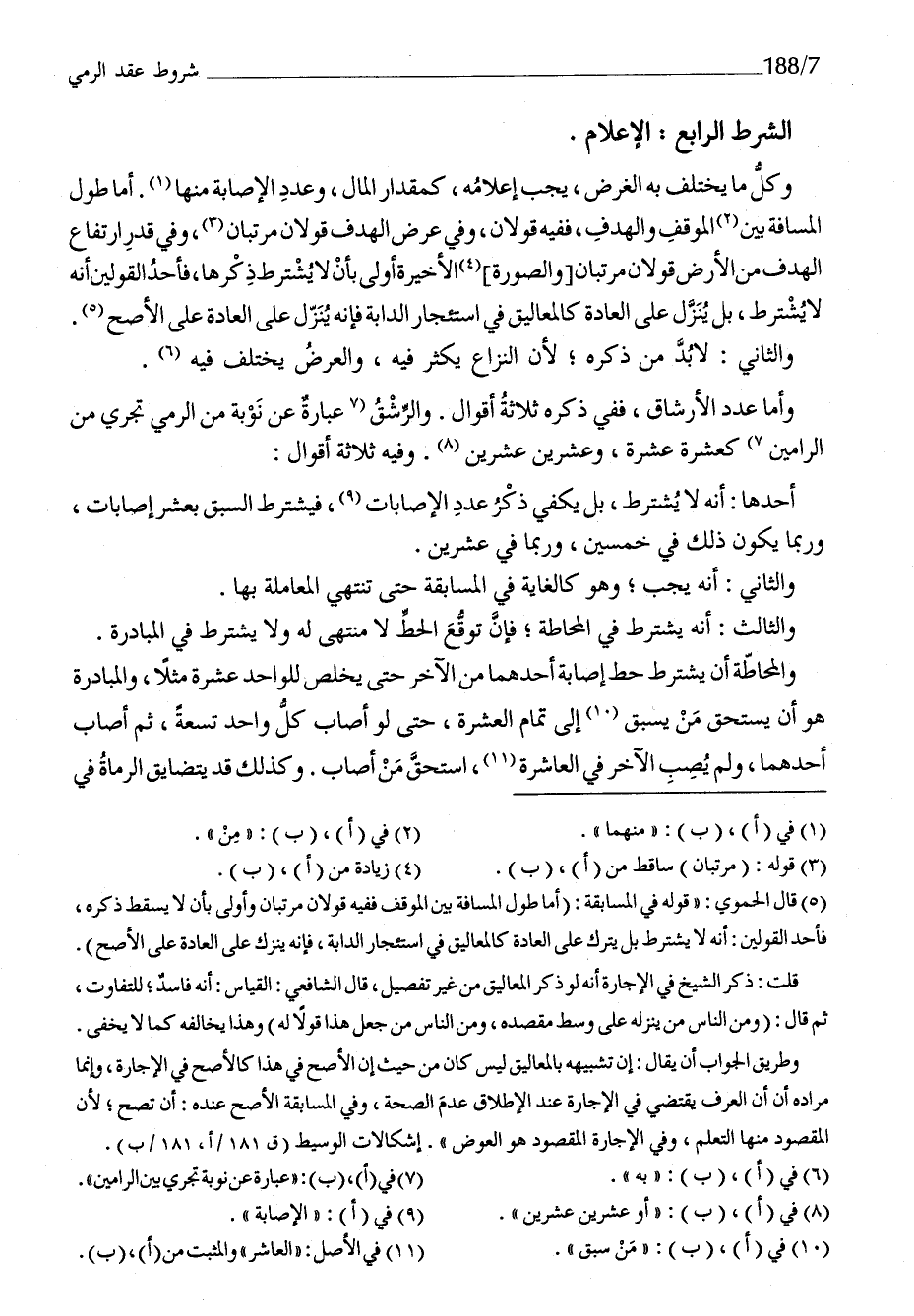 الشَّرْط الرَّابِع الْإِعْلَام وكل مَا يخْتَلف بِهِ الْغَرَض يجب إِعْلَامه كمقدار المَال وَعدد الْإِصَابَة مِنْهَا أما طول الْمسَافَة بَين الْموقف والهدف فَفِيهِ قَولَانِ وَفِي عرض الهدف قَولَانِ مرتبان وَفِي قدر ارْتِفَاع الهدف من الأَرْض قَولَانِ مرتبان وَالصُّورَة الْأَخِيرَة أولى بِأَن لَا يشْتَرط ذكرهَا فأحد الْقَوْلَيْنِ أَنه لَا يشْتَرط بل ينزل على الْعَادة كالمعاليق فِي اسْتِئْجَار الدَّابَّة فَإِنَّهُ ينزل على الْعَادة على الْأَصَح وَالثَّانِي لَا بُد من ذكره لِأَن النزاع يكثر فِيهِ وَالْعرض يخْتَلف فِيهِ