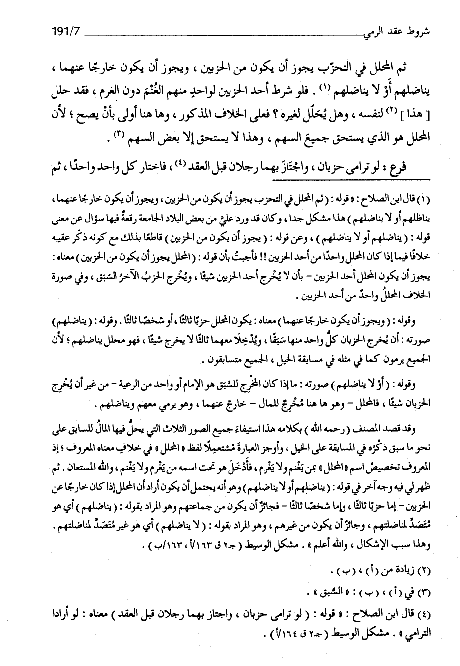 ثمَّ الْمُحَلّل فِي التحزب يجوز أَن يكون من الحزبين وَيجوز أَن يكون خَارِجا عَنْهُمَا يناضلهم أَو لَا يناضلهم فَلَو شَرط أحد الحزبين لوَاحِد مِنْهُم الْغنم دون الْغرم فقد حلل هَذَا لنَفسِهِ وَهل يحلل لغيره فعلى الْخلاف الْمَذْكُور وَهَا هُنَا اولى بِأَن يَصح لِأَن الْمُحَلّل هُوَ الَّذِي يسْتَحق جَمِيع السهْم وَهَذَا لَا يسْتَحق إِلَّا بعض السهْم