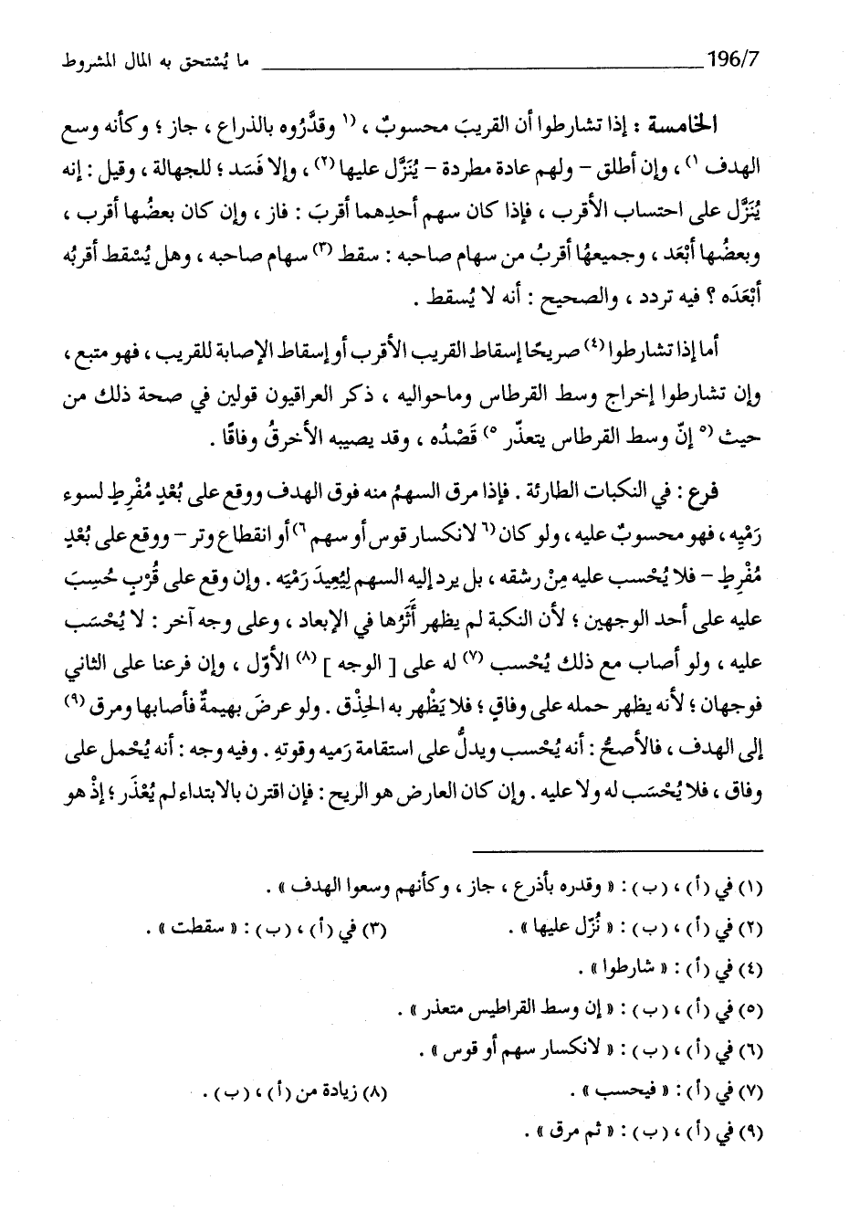 الْخَامِسَة إِذا تشارطوا أَن الْقَرِيب مَحْسُوب وقدروه بالذراع جَازَ وَكَأَنَّهُ وسع الهدف وَإِن أطلق وَلَهُم عَادَة مطردَة ينزل عَلَيْهَا وَإِلَّا فسد للْجَهَالَة وَقيل إِنَّه ينزل على احتساب الْأَقْرَب إِذا كَانَ سهم أَحدهمَا أقرب فَازَ وَإِن كَانَ بَعْضهَا أقرب وَبَعضهَا أبعد وجميعا أقرب من سِهَام صَاحبه سقط سِهَام صَاحبه وَهل يسْقط أقربه أبعده فِيهِ تردد وَالصَّحِيح أَنه لَا يسْقط