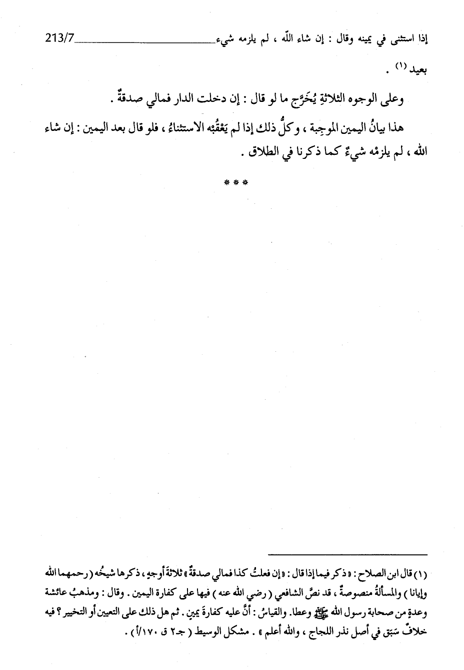 بعيد وعَلى الْوُجُوه الثَّلَاثَة يخرج مَا لَو قَالَ إِن دخلت الدَّار فَمَالِي صَدَقَة هَذَا بَيَان الْيَمين الْمُوجبَة وكل ذَلِك إِذا لم يعقبه الإستثناء فَلَو قَالَ بعد الْيَمين إِن شَاءَ الله لم يلْزمه شَيْء كَمَا ذكرنَا فِي الطَّلَاق