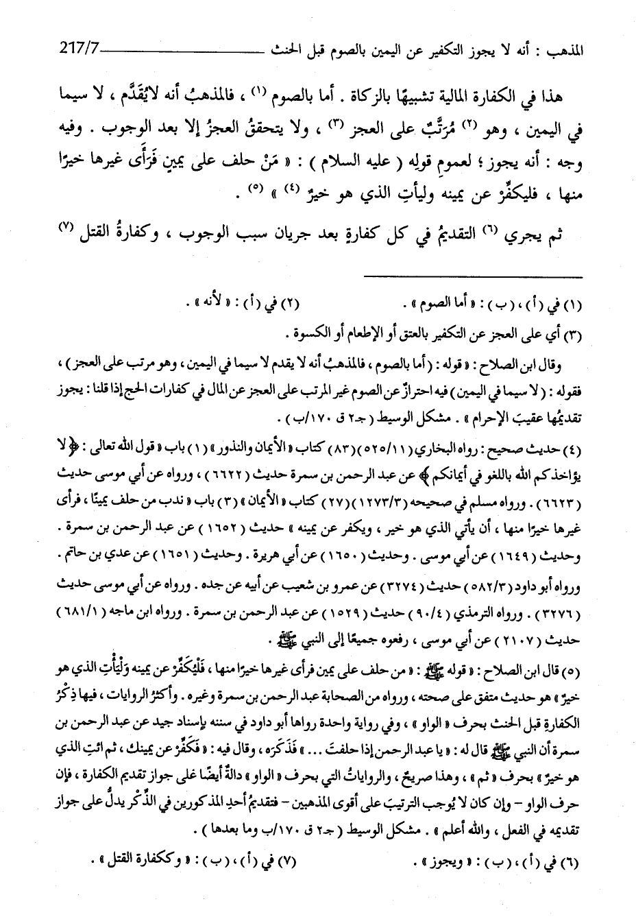 هَذَا فِي الْكَفَّارَة الْمَالِيَّة تَشْبِيها بِالزَّكَاةِ أما بِالصَّوْمِ فَالْمَذْهَب أَنه لَا يقدم لَا سِيمَا فِي الْيَمين وَهُوَ مُرَتّب على الْعَجز وَلَا يتَحَقَّق الْعَجز إِلَّا بعد الْوُجُوب وَفِيه وَجه أَنه يجوز لعُمُوم قَوْله عَلَيْهِ السَّلَام من حلف على يَمِين فَرَأى غَيرهَا خيرا مِنْهَا فليكفر عَن يَمِينه وليأت الَّذِي هُوَ خير ثمَّ يجْرِي التَّقْدِيم فِي كل كَفَّارَة بعد جَرَيَان سَبَب الْوُجُوب وَكَفَّارَة الْقَتْل
