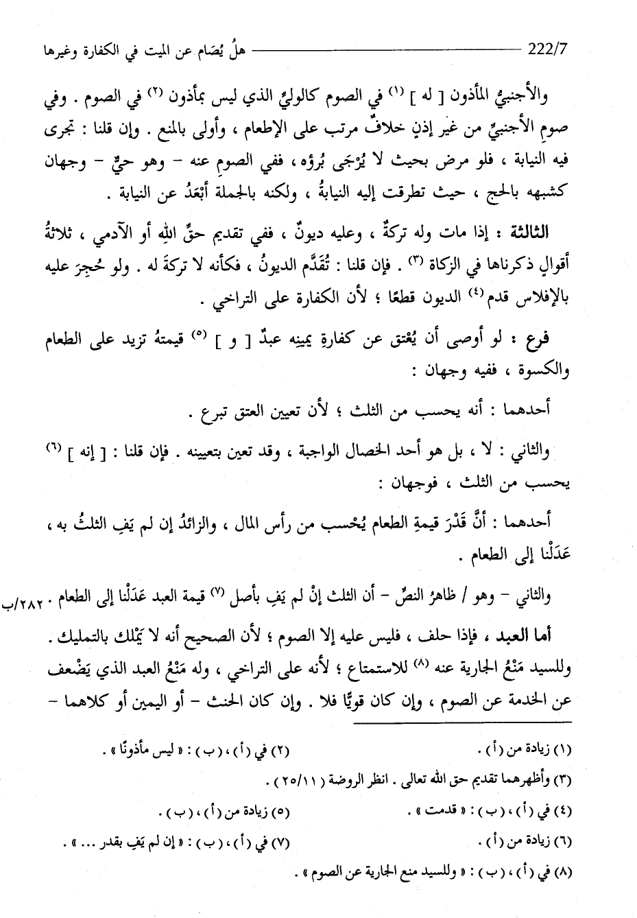 فرع لَو أوصى أَن يعْتق عَن كَفَّارَة يَمِينه عبد وَقِيمَته تزيد على الطَّعَام وَالْكِسْوَة فَفِيهِ وَجها أَحدهمَا أَنه يحْسب من الثُّلُث لِأَن تعْيين الْعتْق تبرع وَالثَّانِي لَا بل هُوَ أحد الْخِصَال الْوَاجِبَة وَقد تعين بتعيينه فَإِن قُلْنَا إِنَّه يحْسب من الثُّلُث فَوَجْهَانِ أَحدهمَا أَن قدر قيمَة الطَّعَام يحْسب من رَأس المَال وَالزَّائِد إِن لم يَفِ الثُّلُث بِهِ عدلنا إِلَى الطَّعَام وَالثَّانِي وَهُوَ ظَاهر النَّص أَن الثُّلُث إِن لم يَفِ بِأَصْل قيمَة العَبْد عدلنا إِلَى الطَّعَام