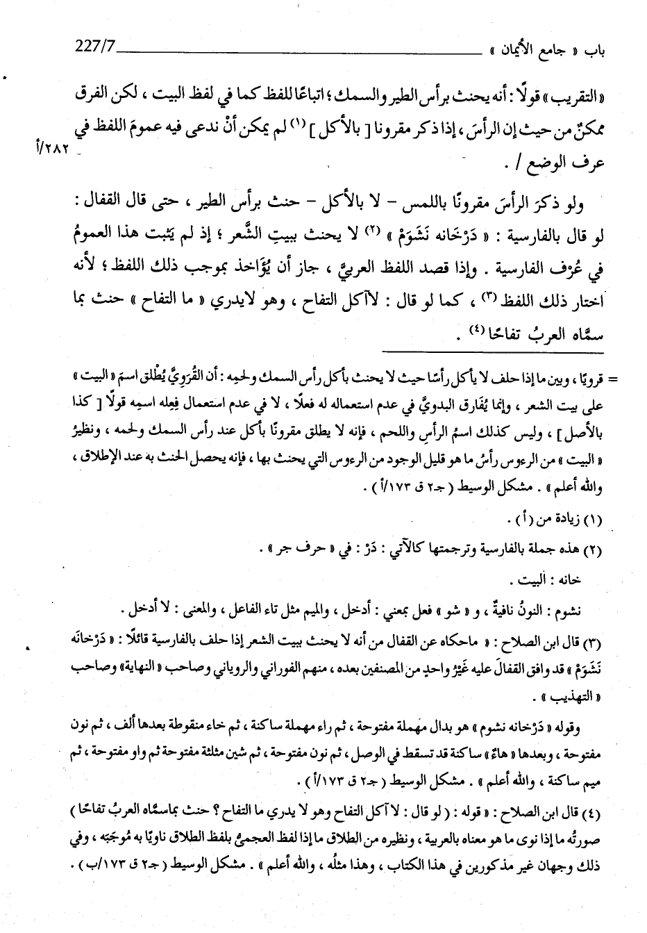 وَلَو ذكر الرَّأْس مَقْرُونا باللمس لَا بِالْأَكْلِ حنث بِرَأْس الطير حَتَّى قَالَ الْقفال لَو قَالَ بِالْفَارِسِيَّةِ درخانه نشوم لَا يَحْنَث بِبَيْت الشّعْر إِذْ لم يثبت هَذَا الْعُمُوم فِي عرف الفارسية وَإِذا قصد اللَّفْظ الْعَرَبِيّ جَازَ أَن يُؤَاخذ بِمُوجب ذَلِك اللَّفْظ لِأَنَّهُ اخْتَار ذَلِك اللَّفْظ كَمَا لَو قَالَ لَا آكل التفاح وَهُوَ لَا يدْرِي مَا التفاح حنث بِمَا سَمَّاهُ الْعَرَب تفاحا