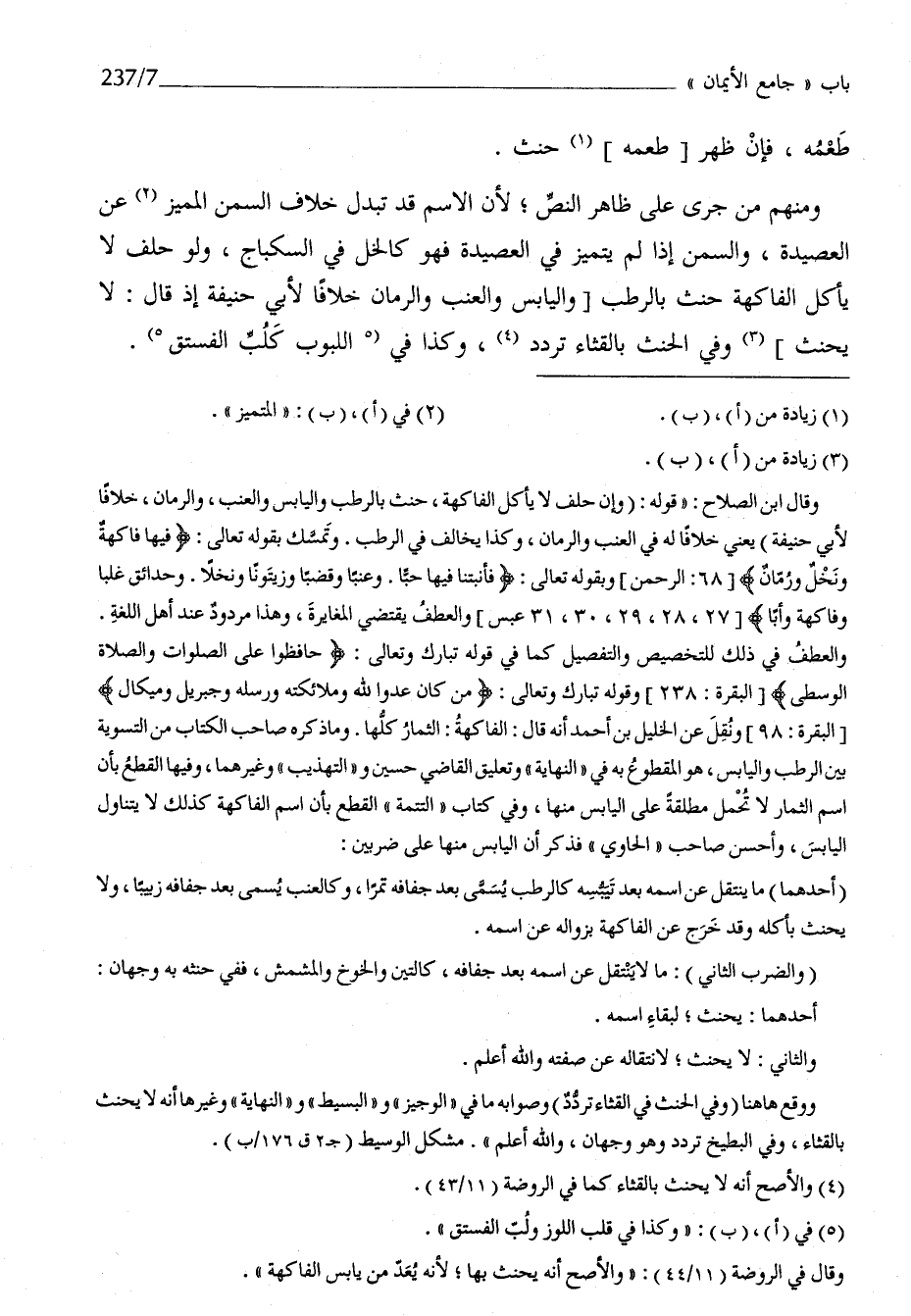 وَمِنْهُم من جرى على ظَاهر النَّص لِأَن الإسم قد تبدل خلاف السّمن الْمُمَيز عَن العصيدة وَالسمن وَإِذا لم يتَمَيَّز فِي العصيدة فَهُوَ كالخل فِي السكباج وَلَو حلف لَا يَأْكُل الْفَاكِهَة حنث بالطرب واليابس وَالْعِنَب وَالرُّمَّان خلافًا لأبي حنيفَة إِذْ قَالَ لَا يَحْنَث وَفِي الْحِنْث بالقثاء تردد وَكَذَا فِي اللبوب كلب الفستق