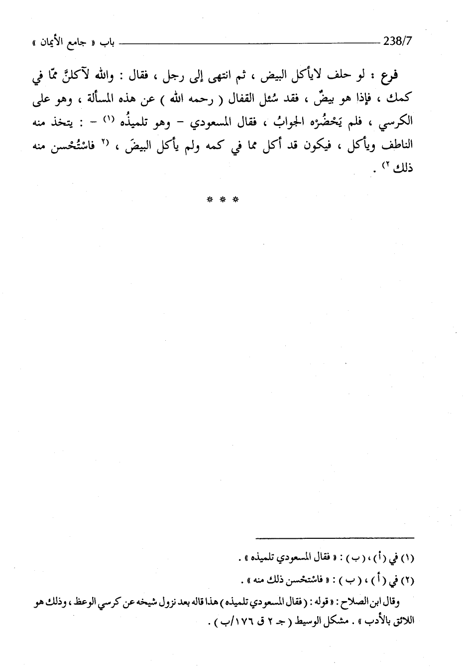 فرع لَو حلف لَا يَأْكُل الْبيض ثمَّ انْتهى إِلَى رجل فَقَالَ وَالله لآكلن مِمَّا فِي كمك فَإِذا هُوَ بيض فقد سُئِلَ الْقفال رَحمَه الله عَنهُ هَذِه الْمَسْأَلَة وَهُوَ على الْكُرْسِيّ فَلم يحضرهُ الْجَواب فَقَالَ المَسْعُودِيّ وَهُوَ تِلْمِيذه يتَّخذ مِنْهُ الناطف وَيَأْكُل فَيكون قد أكل مِمَّا فِي كمه وَلم يَأْكُل الْبيض فَاسْتحْسن مِنْهُ ذَلِك