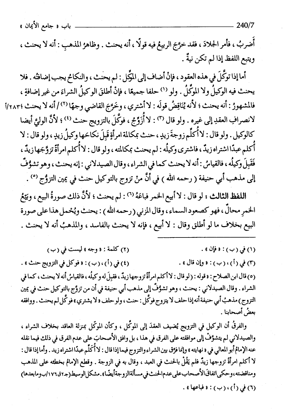 أما إِذا توكل فِي هَذِه الْعُقُود فَإِن أضَاف إِلَى الْمُوكل لم يَحْنَث وَالنِّكَاح يجب إِضَافَته فَلَا يَحْنَث فِيهِ الْوَكِيل وَلَا الْمُوكل وَلَو حلفا جَمِيعًا فَإِن اطلق الْوَكِيل الشِّرَاء من غير إِضَافَة فَالْمَشْهُور أَنه يَحْنَث لِأَنَّهُ يُنَاقض قَوْله لَا أَشْتَرِي وَخرج القَاضِي وَجها أَنه لَا يَحْنَث لانصراف العقد إِلَى غَيره وَلَو قَالَ لَا أزوج فَوكل بِالتَّزْوِيجِ حنث لِأَن الْوَلِيّ أَيْضا كَالْوَكِيلِ وَلَو قَالَ لَا أكلم زَوْجَة زيد حنث بمكالمة امْرَأَة قبل نِكَاحهَا وَكيل زيد وَلَو قَالَ لَا أكلم عبدا اشْتَرَاهُ زيد فَاشْترى وَكيله لم يَحْنَث بمكالمته وَلَو قَالَ لَا أكلم امْرَأَة تزَوجهَا زيد فَقبل وَكيله فَالْقِيَاس أَنه لَا يَحْنَث كَمَا فِي الشِّرَاء وَقَالَ الصيدلاني إِنَّه يَحْنَث وَهُوَ تشوف إِلَى مَذْهَب أبي حنيفَة رَحمَه الله فِي أَن من تزوج بِالتَّوْكِيلِ حنث فِي يَمِين التَّزَوُّج