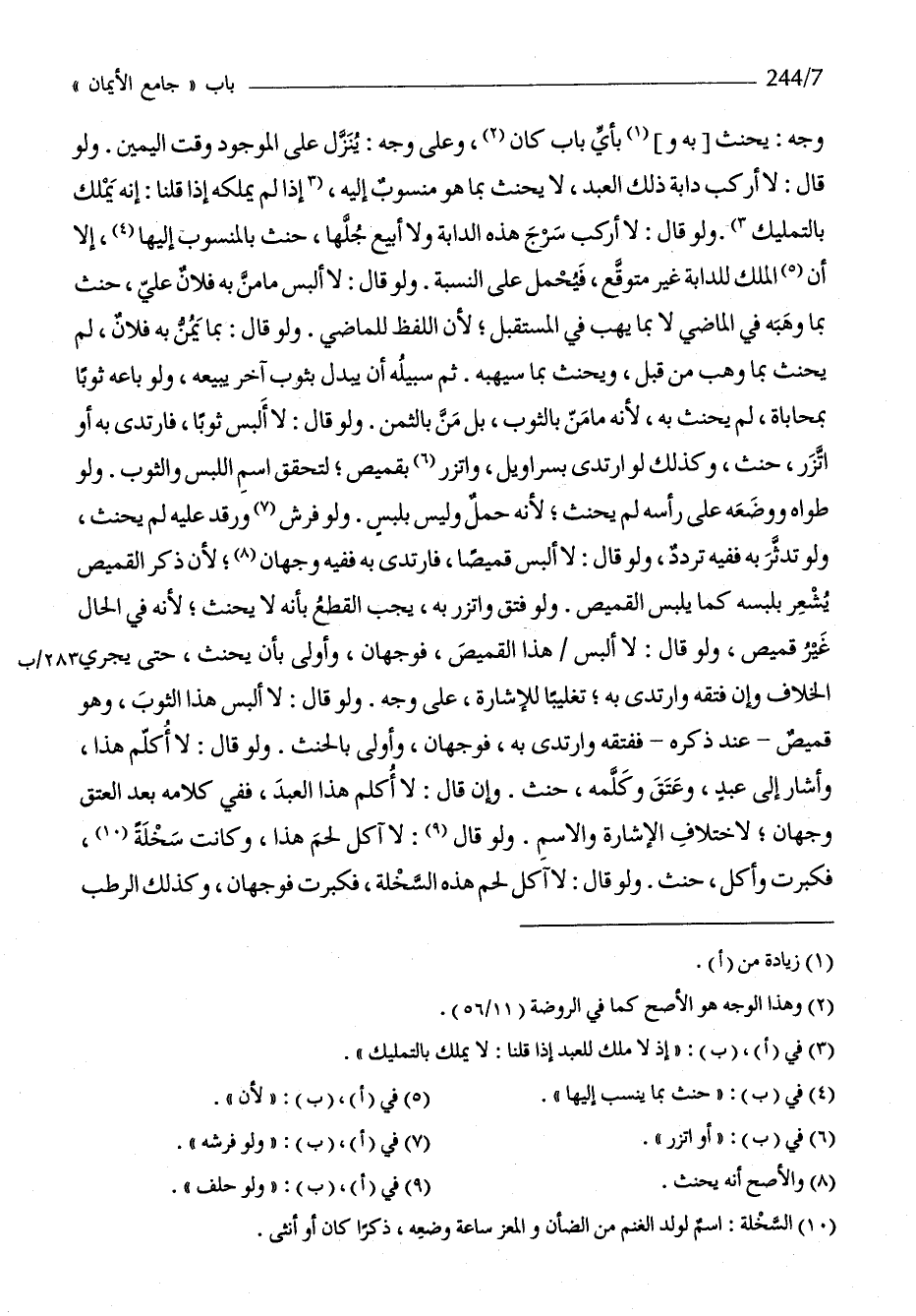 وَجه يَحْنَث بِهِ وَبِأَيِّ بَاب كَانَ وعَلى وَجه ينزل على الْمَوْجُود وَقت الْيَمين وَلَو قَالَ لَا أركب دَابَّة ذَلِك العَبْد لَا يَحْنَث بِمَا هُوَ مَنْسُوب إِلَيْهِ إِذا لم يملكهُ إِذا قُلْنَا إِنَّه يملك بالتمليك وَلَو قَالَ لَا أركب سرج هَذِه الدَّابَّة وَلَا أبيع جلها حنث بالمنسوب إِلَيْهَا إِلَّا أَن الْملك للدابة غير متوقع فَيحمل على النِّسْبَة وَلَو قَالَ لَا ألبس مَا من بِهِ فلَان عَليّ حنث بِمَا وهبه فِي الْمَاضِي لَا بِمَا يهب فِي الْمُسْتَقْبل لِأَن اللَّفْظ للماضي وَلَو قَالَ بِمَا يمن بِهِ فلَان لم يَحْنَث بِمَا وهب من قبل وَيحنث بِمَا سيهبه ثمَّ سَبيله أَن يُبدل بِثَوْب آخر يَبِيعهُ وَلَو بَاعه ثوبا بمحاباة لم يَحْنَث بِهِ لِأَنَّهُ مَا من بِالثَّوْبِ بل من بِالثّمن وَلَو قَالَ لَا ألبس ثوبا فارتدى بِهِ أَو اتزر حنث وَكَذَلِكَ لَو ارتدى بسراويل واتزر بقميص لتحَقّق اسْم اللّبْس وَالثَّوْب وَلَو طواه وَوَضعه على رَأسه لم يَحْنَث لِأَنَّهُ حمل وَلَيْسَ بِلبْس وَلَو فرش ورقد عَلَيْهِ لم يَحْنَث وَلَو تدثر بِهِ فَفِيهِ تردد وَلَو قَالَ لَا ألبس قيمصا فارتدى بِهِ فَفِيهِ وَجْهَان لِأَن ذكر الْقَمِيص يشْعر بلبسه كَمَا يلبس الْقَمِيص وَلَو فتق واتزر بِهِ يجب الْقطع بِأَنَّهُ لَا يَحْنَث لِأَنَّهُ فِي الْحَال غير قَمِيص وَلَو قَالَ لَا ألبس هَذَا الْقَمِيص فَوَجْهَانِ وَأولى بِأَن يَحْنَث حَتَّى يجْرِي الْخلاف وَإِن فتقه وارتدى بِهِ تَغْلِيبًا للْإِشَارَة على وَجه وَلَو قَالَ لَا ألبس هَذَا الثَّوْب وَهُوَ قَمِيص عِنْد ذكره ففتقه وارتدى بِهِ فَوَجْهَانِ وَأولى بِالْحِنْثِ وَلَو قَالَ لَا أكلم هَذَا وَأَشَارَ إِلَى عبد وَعتق وَكَلمه حنث وَإِن قَالَ لَا أكلم هَذَا العَبْد فَفِي كَلَامه بعد الْعتْق وَجْهَان لاخْتِلَاف الْإِشَارَة والإسم وَلَو قَالَ لَا آكل لحم هَذَا وَكَانَت سخلة فكبرت وَأكل حنث وَلَو قَالَ لَا آكل لحم هَذِه السخلة فكبرت فَوَجْهَانِ وَكَذَلِكَ الرطب