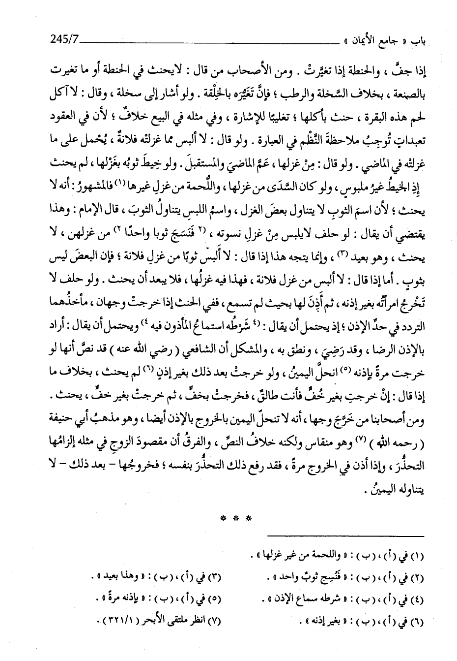 إِذا جف وَالْحِنْطَة إِذا تَغَيَّرت وَمن الْأَصْحَاب من قَالَ لَا يَحْنَث فِي الْحِنْطَة أَو مَا تَغَيَّرت بالصنعة بِخِلَاف السخلة وَالرّطب فَإِن تغيره بالخلقة وَلَو أَشَارَ إِلَى سخلة وَقَالَ لَا آكل لحم هَذِه الْبَقَرَة حنث بأكلها تَغْلِيبًا للْإِشَارَة وَفِي مثله فِي البيع خلاف لِأَن فِي الْعُقُود تعبدات توجب مُلَاحظَة النّظم فِي الْعبارَة وَلَو قَالَ لَا ألبس مِمَّا غزلته فُلَانَة يحمل على مَا غزلته فِي الْمَاضِي وَلَو قَالَ من غزلها عَم الْمَاضِي والمستقبل وَلَو خيط ثَوْبه بغزلها لم يَحْنَث إِذْ الْخَيط غير ملبوس وَلَو كَانَ السّديّ من غزلها واللحمة من غزل غَيرهَا فَالْمَشْهُور أَنه لَا يَحْنَث لِأَن اسْم الثَّوْب لَا يتَنَاوَل بعض الْغَزل وَاسم اللّبْس يتَنَاوَل الثَّوْب قَالَ الإِمَام وَهَذَا يَقْتَضِي أَن يُقَال لَو حلف لَا يلبس من غزل نسوته فنسج ثوبا وَاحِدًا من غزلهن لَا يَحْنَث وَهُوَ بعيد وَإِنَّمَا يتَّجه هَذَا إِذا قَالَ لَا ألبس ثوبا من غزل فُلَانَة فَإِن الْبَعْض لَيْسَ بِثَوْب أما إِذا قَالَ لَا ألبس من غزل فُلَانَة فَهَذَا فِيهِ غزلها فَلَا يبعد أَن يَحْنَث وَلَو حلف لَا تخرج امْرَأَته بِغَيْر إِذْنه ثمَّ أذن لَهَا بِحَيْثُ لم تسمع فَفِي الْحِنْث إِذا خرجت وَجْهَان مأخذهما التَّرَدُّد فِي حد الْإِذْن إِذْ يحْتَمل أَن يُقَال شَرطه اسْتِمَاع الْمَأْذُون فِيهِ وَيحْتَمل أَن يُقَال أَرَادَ بِالْإِذْنِ الرِّضَا وَقد رَضِي ونطق بِهِ والمشكل أَن الشَّافِعِي رَضِي الله عَنهُ قد نَص أَنَّهَا لَو خرجت مرّة بِإِذْنِهِ انحل الْيَمين وَلَو خرجت بعد ذَلِك بِغَيْر إِذن لم يَحْنَث بِخِلَاف مَا إِذا قَالَ إِن خرجت بِغَيْر خف فَأَنت طَالِق فَخرجت بخف ثمَّ خرجت بِغَيْر خف يَحْنَث وَمن أَصْحَابنَا من خرج وَجها أَنه لَا تنْحَل الْيَمين بِالْخرُوجِ بِالْإِذْنِ أَيْضا وَهُوَ مَذْهَب أبي حنيفَة رَحمَه الله وَهُوَ منقاس وَلكنه خلاف النَّص وَالْفرق أَن مَقْصُود الزَّوْج فِي مثله إلزامها التحذر وَإِذا أذن فِي الْخُرُوج مرّة فقد رفع ذَلِك التحذر بِنَفسِهِ فخروجها بعد ذَلِك لَا يتَنَاوَلهُ الْيَمين