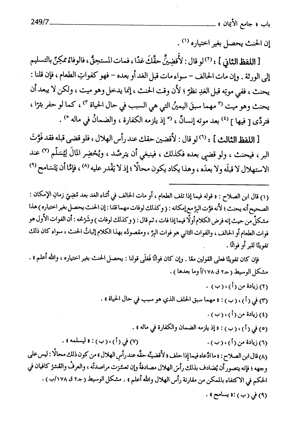 اللَّفْظ الثَّالِث لَو قَالَ لأقضين حلقك عِنْد رَأس الْهلَال فَلَو قضى قبله فقد فَوت الْبر فَيحنث وَلَو قضى بعده فَكَذَلِك فَيَنْبَغِي أَن يترصد ويحضر المَال ليسلم عِنْد الإستهلال لَا قبله وَلَا بعده وَهَذَا يكَاد يكون محالا إِذْ لَا يقدر عَلَيْهِ فإمَّا أَن يتَسَامَح