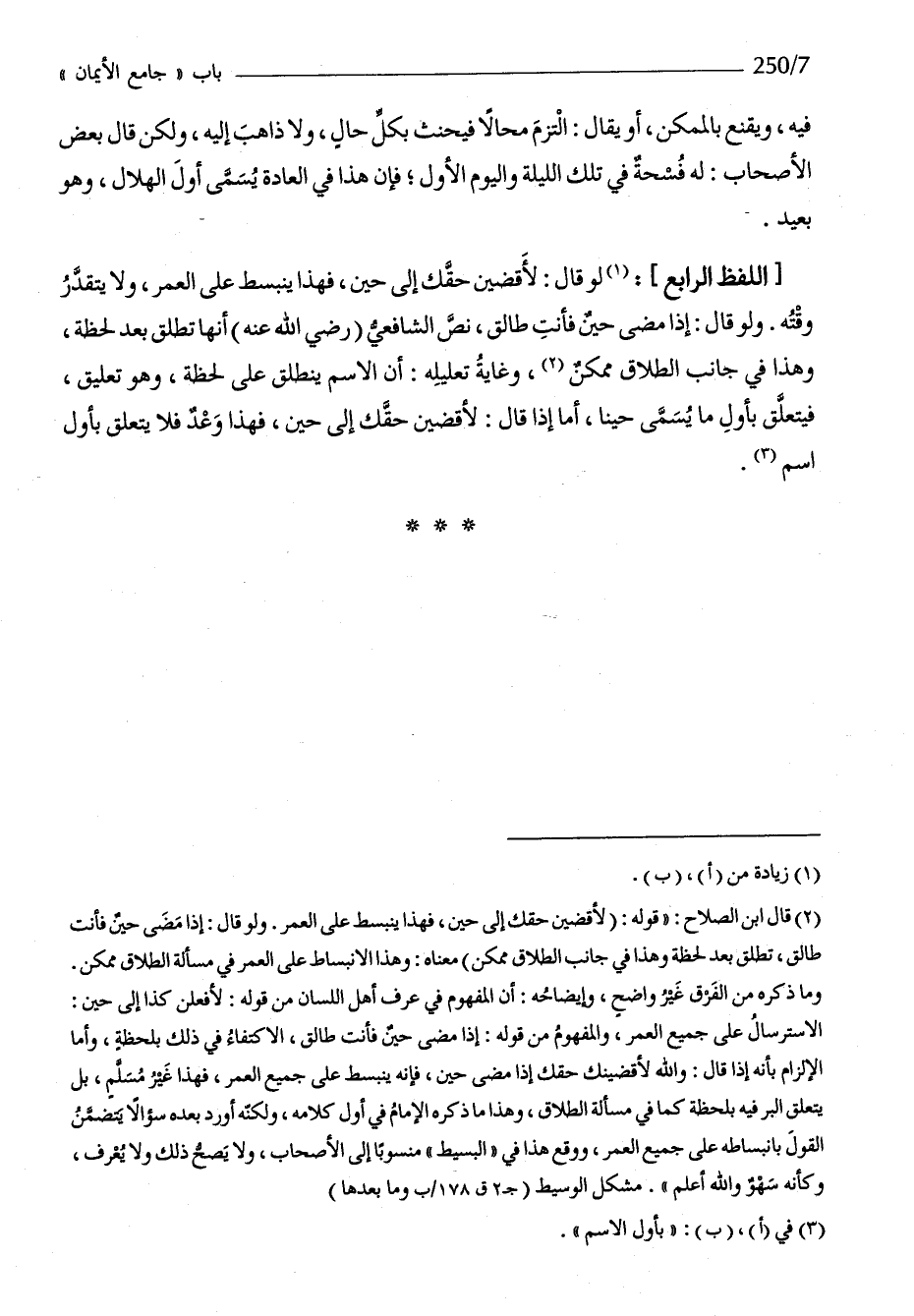اللَّفْظ الرَّابِع لَو قَالَ لأقضين حَقك إِلَى حِين فَهَذَا ينبسط على الْعُمر وَلَا يتَقَدَّر وقته وَلَو قَالَ إِذا مضى حِين فَأَنت طَالِق نَص الشَّافِعِي رَضِي الله عَنهُ أَنَّهَا تطلق بعد لَحْظَة وَهَذَا فِي جَانب الطَّلَاق مُمكن وَغَايَة تَعْلِيله أَن الإسم ينْطَلق على لَحْظَة وَهُوَ تَعْلِيق فَيتَعَلَّق بِأول مَا يُسمى حينا أما إِذا قَالَ لأقضين حَقك إِلَى حِين فَهَذَا وعد فَلَا يتَعَلَّق بِأول اسْم