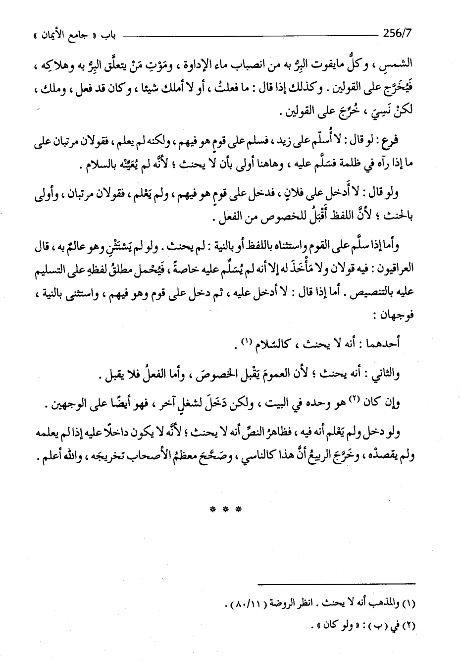 وَأما إِذا سلم على الْقَوْم واستثناه بِاللَّفْظِ أَو بِالنِّيَّةِ لم يَحْنَث وَلَو لم يسْتَثْن وَهُوَ عَالم بِهِ قَالَ الْعِرَاقِيُّونَ فِيهِ قَولَانِ وَلَا مَأْخَذ لَهُ إِلَّا أَنه لم يسلم عَلَيْهِ خَاصَّة فَيحمل مُطلق لَفظه على التَّسْلِيم عَلَيْهِ بالتنصيص أما إِذا قَالَ لَا أَدخل عَلَيْهِ ثمَّ دخل على قوم وَهُوَ فيهم وَاسْتثنى بِالنِّيَّةِ فَوَجْهَانِ أَحدهمَا أَنه لَا يَحْنَث كالسلام وَالثَّانِي أَنه يَحْنَث لِأَن الْعُمُوم يقبل الْخُصُوص وَأما الْفِعْل فَلَا يقبل وَإِن كَانَ هُوَ وَحده فِي الْبَيْت وَلَكِن دخل لشغل آخر فَهُوَ أَيْضا على الْوَجْهَيْنِ وَلَو دخل وَلم يعلم أَنه فِيهِ فَظَاهر النَّص أَنه لَا يَحْنَث لِأَنَّهُ لَا يكون دَاخِلا عَلَيْهِ إِذا لم يُعلمهُ وَلم يَقْصِدهُ وَخرج الرّبيع أَن هَذَا كالناسي وَصحح مُعظم الْأَصْحَاب تَخْرِيجه وَالله أعلم