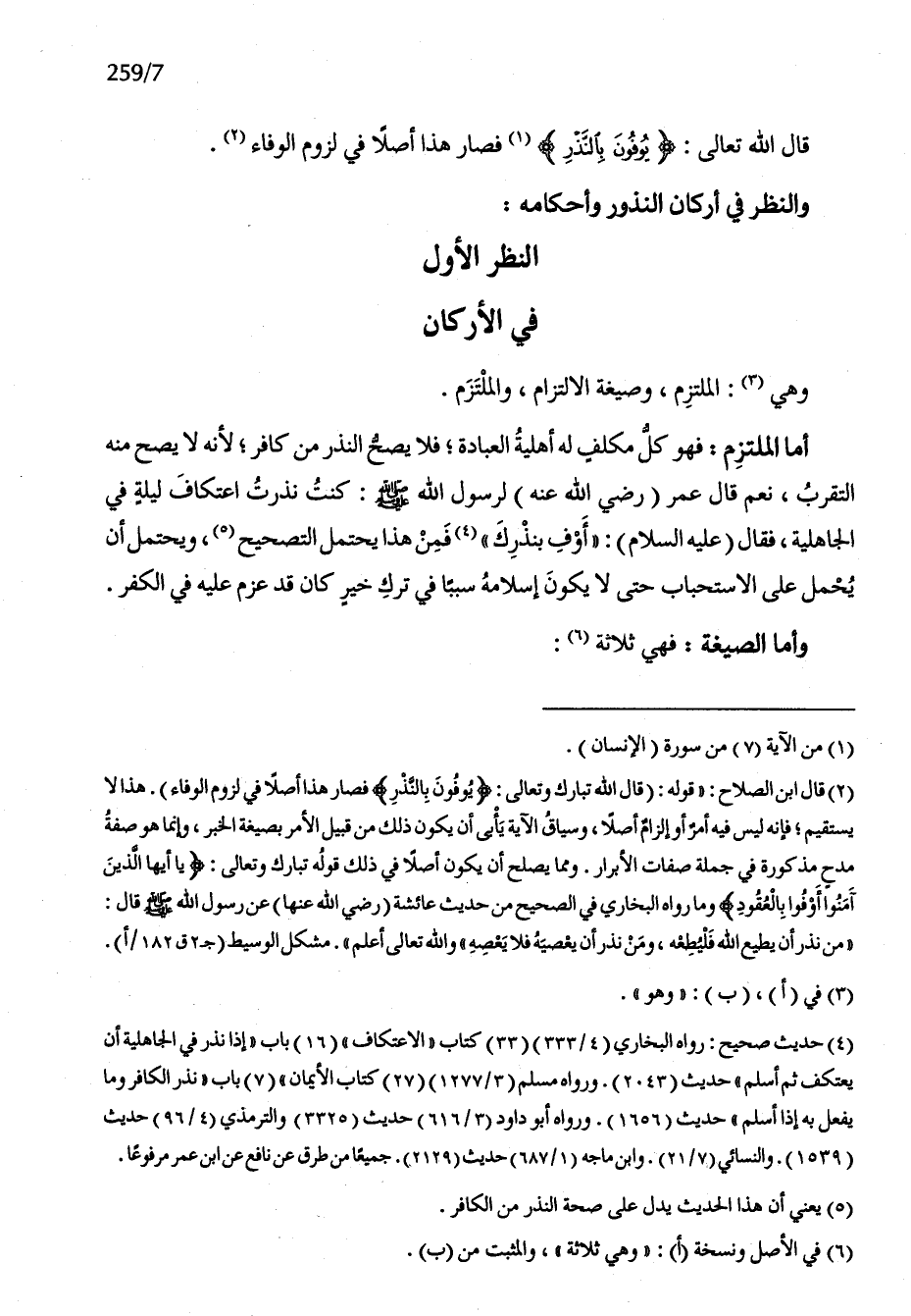 قَالَ الله تَعَالَى {يُوفونَ بِالنذرِ} فَصَارَ هَذَا أصلا فِي لُزُوم الْوَفَاء وَالنَّظَر فِي أَرْكَان النذور وَأَحْكَامه