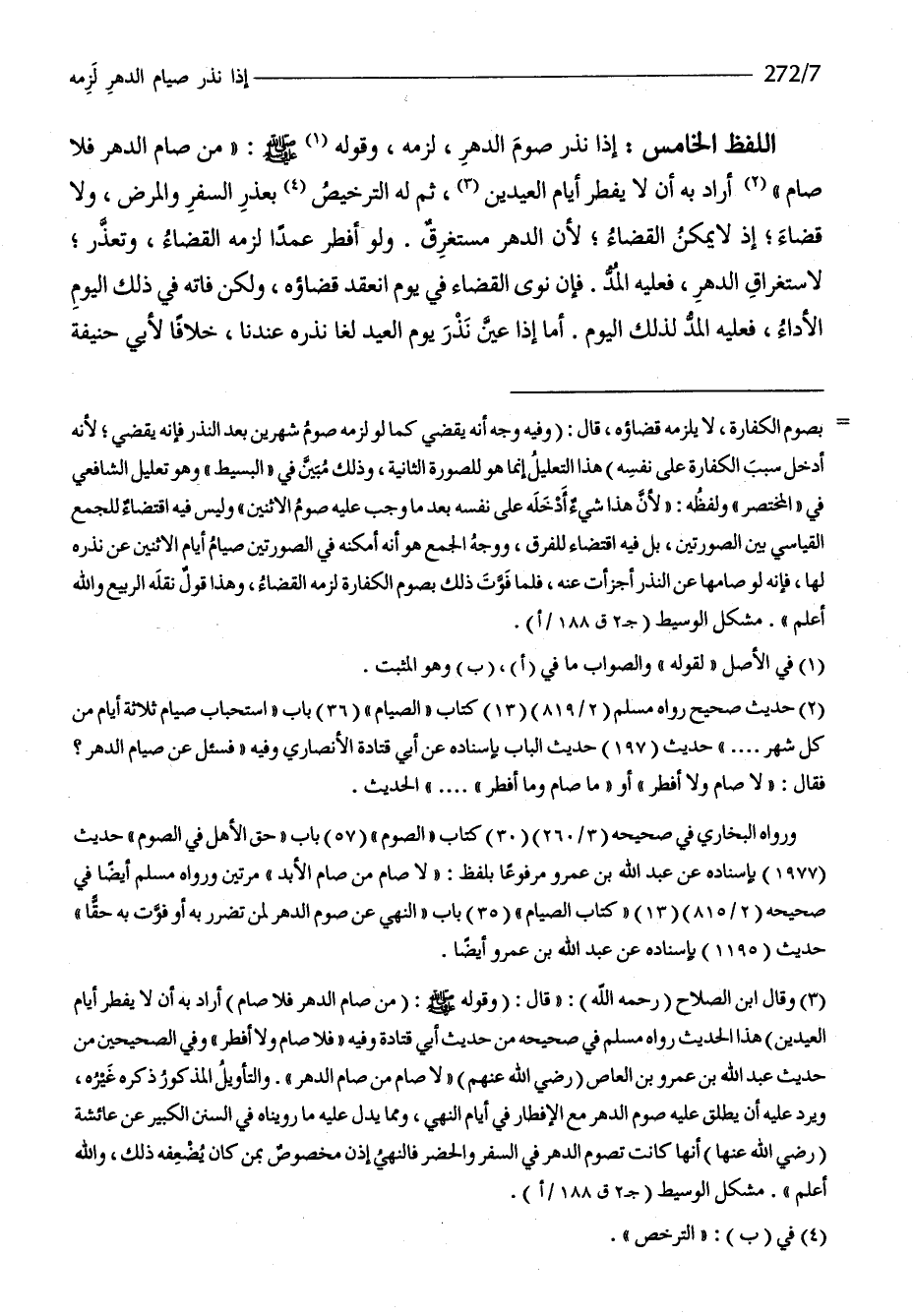 اللَّفْظ الْخَامِس إِذا نذر صَوْم الدَّهْر لزمَه وَقَوله صلى الله عَلَيْهِ وَسلم من صَامَ الدَّهْر فَلَا صَامَ أَرَادَ بِهِ أَن لَا يفْطر أَيَّام الْعِيدَيْنِ ثمَّ لَهُ الترخيص بِعُذْر السّفر وَالْمَرَض وَلَا قَضَاء إِذْ لَا يُمكن الْقَضَاء لِأَن الده مُسْتَغْرق وَلَو أفطر عمدا لزمَه الْقَضَاء وَتعذر لاستغراق الدهل فَعَلَيهِ الْمَدّ فَإِن نوى الْقَضَاء فِي يَوْم انْعَقَد قَضَاؤُهُ وَلَكِن فَاتَهُ فِي ذَلِك الْيَوْم الْأَدَاء فَعَلَيهِ الْمَدّ لذَلِك الْيَوْم أما إِذْ عين نذر يَوْم الْعِيد لَغَا نَذره عندنَا خلافًا لأبي حنيفَة
