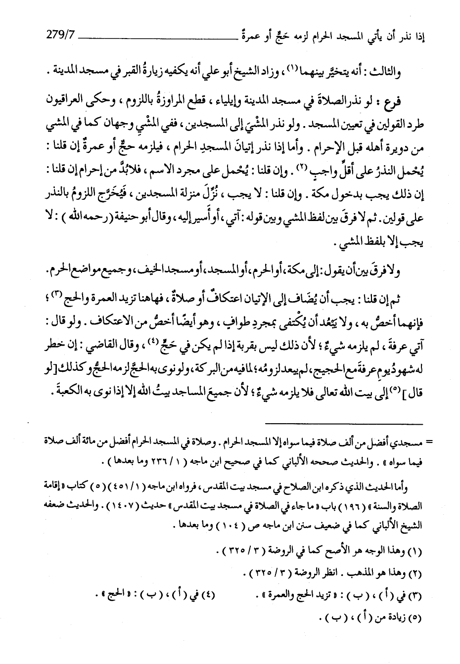 لَو نذر الصَّلَاة فِي مَسْجِد الْمَدِينَة وإيلياء قطع المراوزة باللزوم وَحكى الْعِرَاقِيُّونَ طرد الْقَوْلَيْنِ فِي تعْيين الْمَسْجِد وَلَو نذر الْمَشْي إِلَى المسجدين فَفِي الْمَشْي وَجْهَان كَمَا فِي الْمَشْي من دويرة أَهله قبل الْإِحْرَام وَأما إِذا نذر إتْيَان الْمَسْجِد الْحَرَام فَيلْزمهُ حج أَو عمْرَة إِن قُلْنَا يحمل النّذر على أقل وَاجِب وَإِن قُلْنَا يحمل على مُجَرّد الإسم فَلَا بُد من إِحْرَام إِن قُلْنَا إِن ذَلِك يجب بِدُخُول مَكَّة وَإِن قُلْنَا لَا يجب نزل منزلَة المسجدين فَيخرج اللُّزُوم بِالنذرِ على قَوْلَيْنِ ثمَّ لَا فرق بَين لفظ الْمَشْي وَبَين قَوْله آتِي أَو أَسِير إِلَيْهِ وَقَالَ أَبُو حنيفَة رَحمَه الله لَا يجب إِلَّا بِلَفْظ الْمَشْي وَلَا فرق بَين أَن يَقُول إِلَى مَكَّة أَو الْحرم أَو الْمَسْجِد أَو مَسْجِد الْخيف وَجَمِيع مَوَاضِع الْحرم