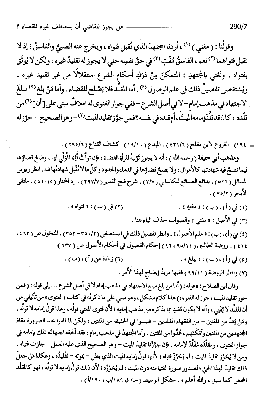 وَقَوْلنَا مفتي أردنَا الْمُجْتَهد الَّذِي تقبل فتواه وَيخرج عَنهُ الصَّبِي وَالْفَاسِق إِذْ لَا تقبل فتواهما نعم الفاص مفت فِي حق نَفسه حَتَّى لَا يجوز لَهُ تَقْلِيد غَيره وَلَكِن لَا يوثق بفتواه ونعني الْمُجْتَهد المتمكن من دَرك أَحْكَام الشَّرْع اسْتِقْلَالا من غير تَقْلِيد غَيره ويستقصى تَفْصِيل ذَلِك فِي علم الْوُصُول أما الْمُقَلّد فَلَا يصلح للْقَضَاء وَأما من بلغ مبلغ الإجتهاد فِي مَذْهَب إِمَام لَا فِي أصل الشَّرْع فَفِي جَوَاز الْفَتْوَى لَهُ خلاف مَبْنِيّ على أَن من قَلّدهُ كَانَ قد قلد إِمَامه الْمَيِّت أم قَلّدهُ فِي نَفسه فَمن جوز تَقْلِيد الْمَيِّت وَهُوَ الصَّحِيح جوز لَهُ