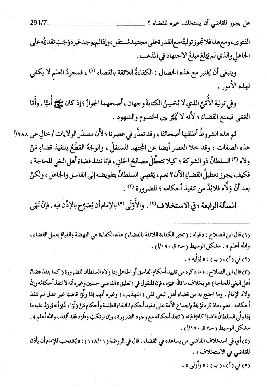 وَيَنْبَغِي أَن يعْتَبر مَعَ هَذِه الْخِصَال الْكَفَاءَة اللائقة بِالْقضَاءِ فمجرد الْعلم لَا يَكْفِي لهَذِهِ الْأُمُور