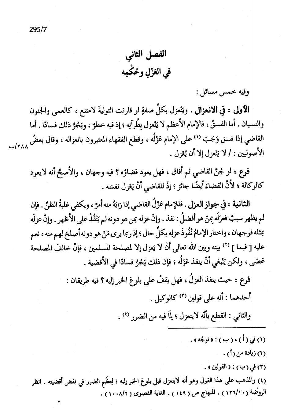 الأولى فِي الإنعزال وينعزل بِكُل صفة لَو قارنت التَّوْلِيَة لامتنع كالعمى وَالْجُنُون وَالنِّسْيَان أما الْفسق فالإمام الْأَعْظَم لَا يَنْعَزِل بطرآنه إِذْ فِيهِ خطر ويجر ذَلِك فَسَادًا أما القَاضِي إِذا فسق وَجب على الإِمَام عَزله وَقطع الْفُقَهَاء المعتبرون بانعزاله وَقَالَ بعض الْأُصُولِيِّينَ لَا يَنْعَزِل إِلَّا أَن يعْزل