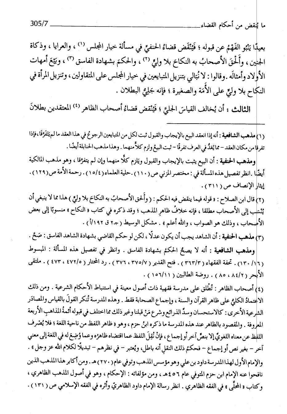 بَعيدا ينبو الْفَهم عَن قبُوله فينقض قَضَاء الْحَنَفِيّ فِي مَسْأَلَة خِيَار الْمجْلس والعرايا وذكاة الْجَنِين وَألْحق الْأَصْحَاب بِهِ النِّكَاح بِلَا ولي وَالْحكم بِشَهَادَة الْفَاسِق وَبيع أُمَّهَات الْأَوْلَاد وَأَمْثَاله وَقَالُوا لَا نبالي بتنزيل الْمُتَبَايعين فِي خِيَار الْمجْلس على المتقاولين وتنزيل الْمَرْأَة فِي النِّكَاح بِلَا ولي على الْأمة وَالصَّغِيرَة فَإِنَّهُ جلي الْبطلَان