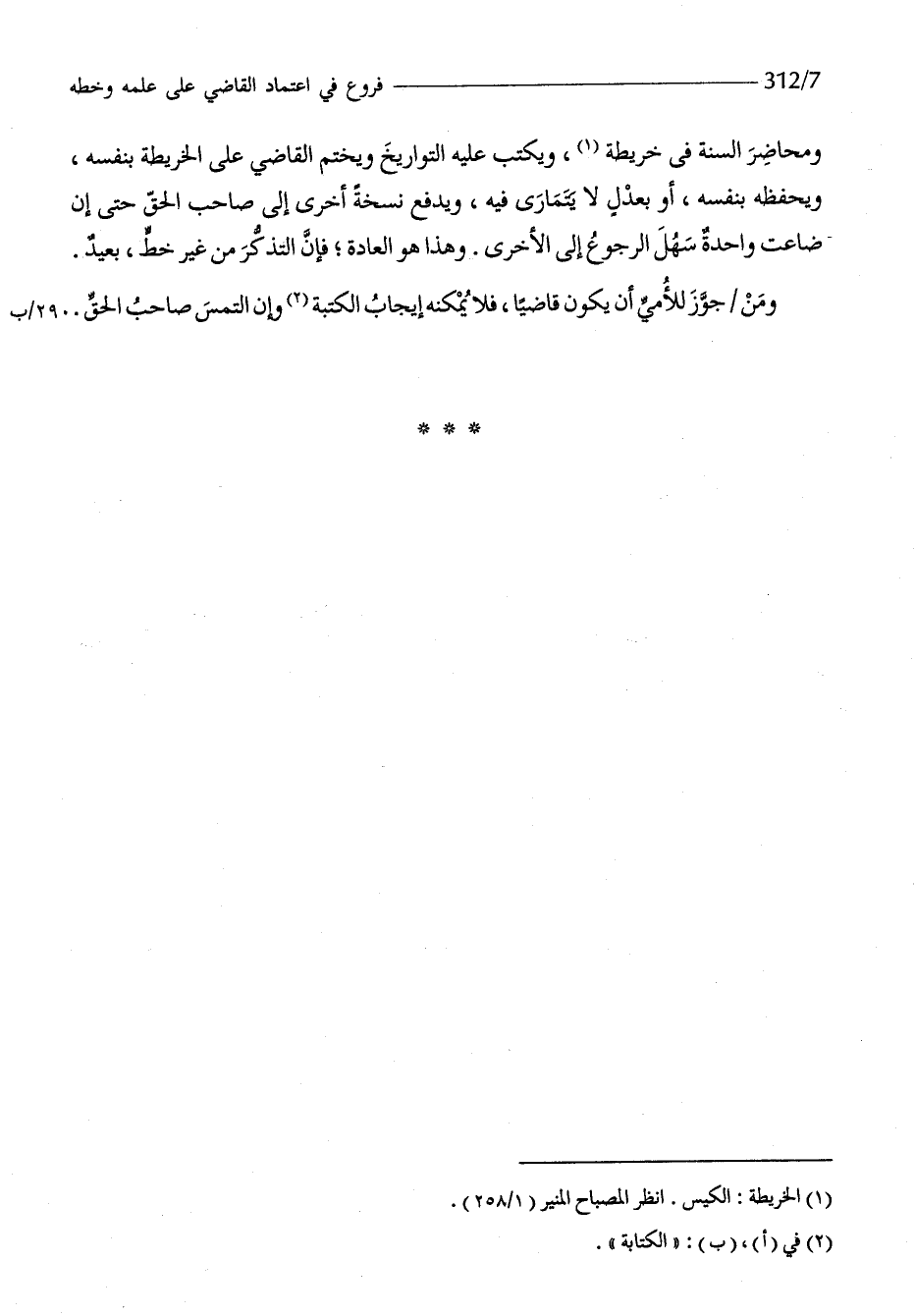ومحاضر السّنة فِي خريطة وَيكْتب عَلَيْهِ التواريخ وَيخْتم القَاضِي على الخريطة بِنَفسِهِ ويحفظه بِنَفسِهِ أَو بِعدْل لَا يتمارى فِيهِ وَيدْفَع نُسْخَة أُخْرَى إِلَى صَاحب الْحق حَتَّى إِن ضَاعَت وَاحِدَة سهل الرُّجُوع إِلَى الْأُخْرَى وَهَذَا هُوَ الْعَادة فَإِن التَّذَكُّر من غير خطّ بعيد وَمن جوز للأمي أَن يكون قَاضِيا فَلَا يُمكنهُ إِيجَاب الكتبة وَإِن التمس صَاحب الْحق