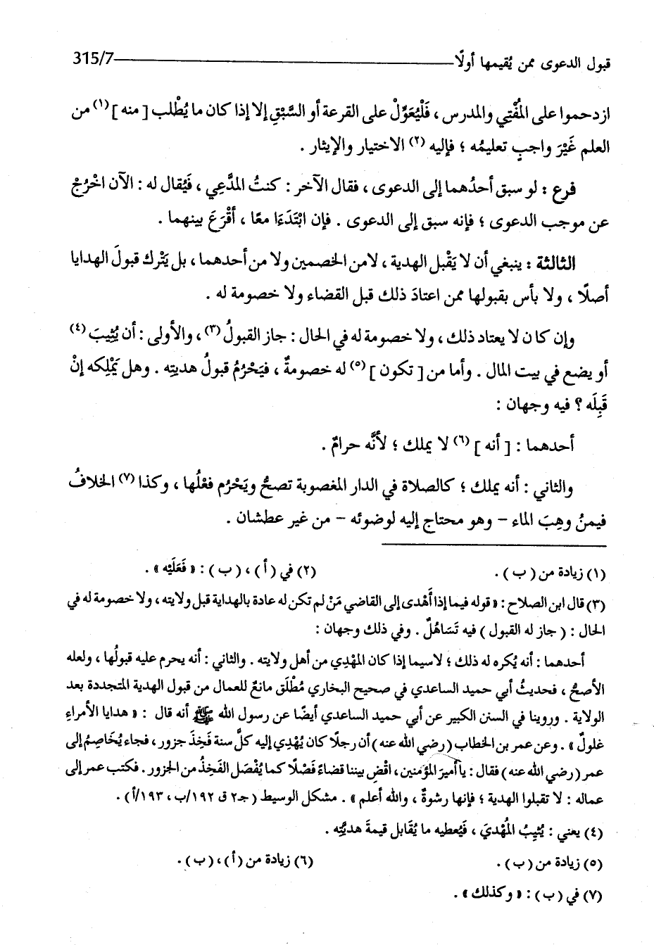 الثَّالِثَة يَنْبَغِي أَن لَا يقبل الْهَدِيَّة لَا من الْخَصْمَيْنِ وَلَا من أَحدهمَا بل يتْرك قبُول الْهَدَايَا أصلا وَلَا بَأْس بقبولها مِمَّن اعْتَادَ ذَلِك قبل الْقَضَاء وَلَا خُصُومَة لَهُ