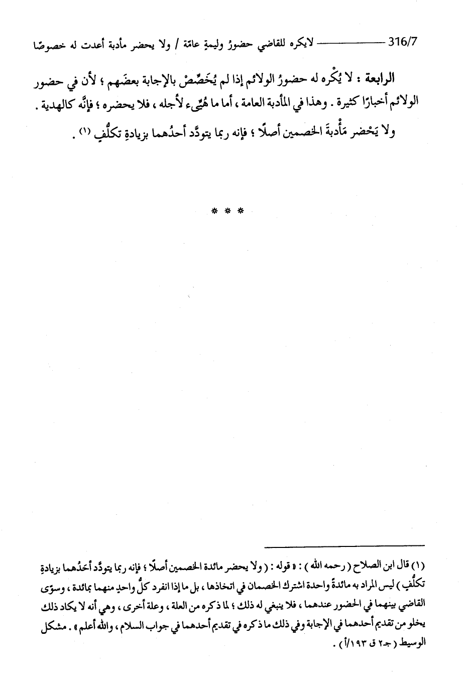 الرَّابِعَة لَا يكره لَهُ حُضُور الولائم إِذا لم يخصص بالإجابة بَعضهم لِأَن فِي حُضُور الولائم أَخْبَارًا كَثِيرَة وَهَذَا فِي المأدبة الْعَامَّة أما مَا هيىء لأَجله فَلَا يحضرهُ فَإِنَّهُ كالهدية