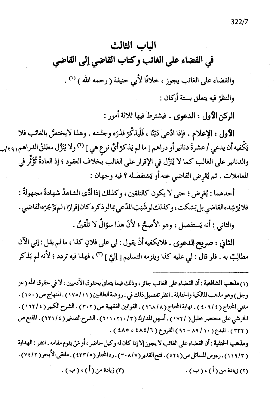 وَالْقَضَاء على الْغَائِب يجوز خلافًا لأبي حنيفَة رَحمَه الله وَالنَّظَر فِيهِ يتَعَلَّق بِسِتَّة أَرْكَان