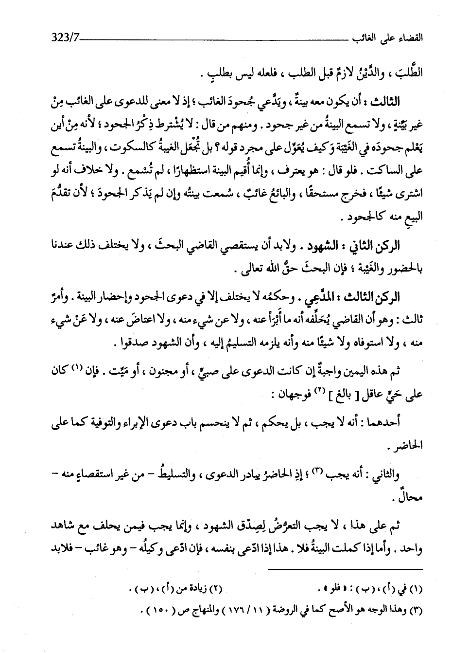 الرُّكْن الثَّانِي الشُّهُود وَلَا بُد أَن يستقصي القَاضِي الْبَحْث وَلَا يخْتَلف ذَلِك عندنَا بالحضور والغيبة فَإِن الْبَحْث حق الله تَعَالَى