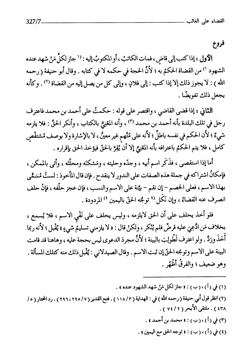 الأول إِذا كتب إِلَى قَاض فَمَاتَ الْكَاتِب أَو الْمَكْتُوب إِلَيْهِ جَازَ لكل من شهد عِنْده الشُّهُود من الْقُضَاة الحكم بِهِ لِأَن الْحجَّة فِي حكمه لَا فِي كِتَابه وَقَالَ أَبُو حنيفَة رَحمَه الله لَا يجوز ذَلِك إِلَّا إِذا كتب إِلَى فلَان وَإِلَى كل من يصل إِلَيْهِ من الْقُضَاة وَكَأَنَّهُ يَجْعَل ذَلِك تفويضا