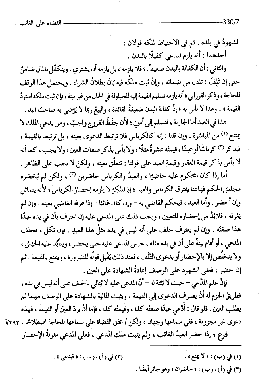 أما إِذا كَانَ الْمَحْكُوم عَلَيْهِ حَاضرا وَالْعَبْد والكرباس حاضرين وَلَكِن لم يحضرهُ مجْلِس الحكم فهاهنا يفْتَرق الكرباس وَالْعَبْد إِذْ الْمُنكر لَا يلْزمه إِحْضَار الكرباس لِأَنَّهُ يتماثل وَإِن أحضر وَأما العَبْد فَيحكم القَاضِي بِهِ وَإِن كَانَ غَائِبا إِذا عرفه القَاضِي بِعَيْنِه وَإِن لم يعرفهُ فَلَا بُد من إِحْضَاره للتعيين وَيجب ذَلِك على الْمُدعى عَلَيْهِ إِن اعْترف بِأَن فِي يَده عبدا هَذَا صفته وَإِن لم يعْتَرف حلف على أَنه لَيْسَ فِي يَده مثل هَذَا العَبْد فَإِن نكل فَحلف الْمُدَّعِي أَو أَقَامَ بَيِّنَة على أَن فِي يَده مثله حبس الْمُدعى عَلَيْهِ حَتَّى يحضر ويتأبد عَلَيْهِ الْحَبْس وَلَا يتَخَلَّص إِلَّا بالإحضار أَو بِدَعْوَى التّلف فَعِنْدَ ذَلِك يقبل قَوْله للضَّرُورَة ويقنع بِالْقيمَةِ ثمَّ إِن حضر فعلى الشُّهُود على الْوَصْف إِعَادَة الشَّهَادَة على الْعين