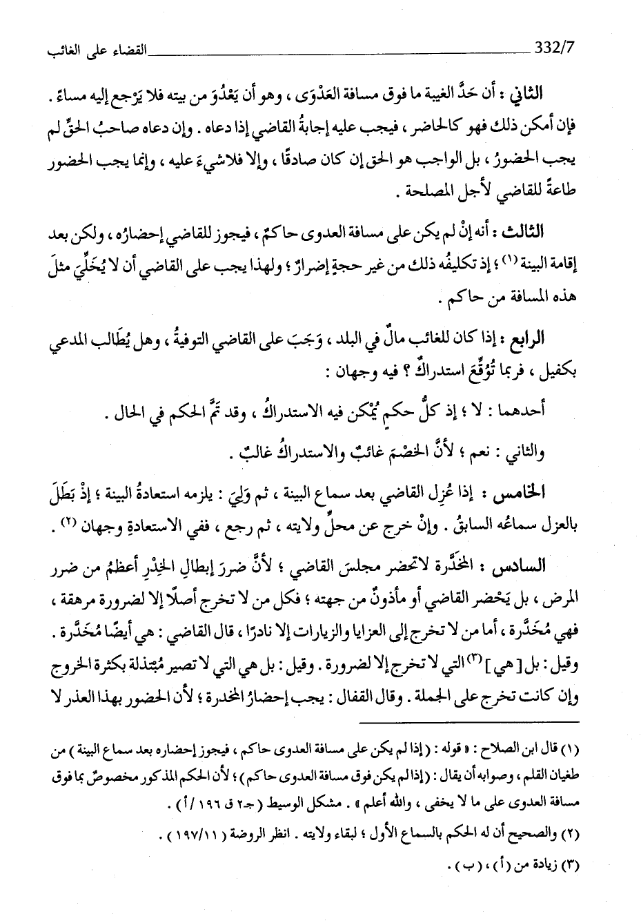 الثَّالِث أَنه إِن لم يكن على مَسَافَة الْعَدْوى حَاكم فَيجوز للْقَاضِي إِحْضَاره وَلَكِن بعد إِقَامَة الْبَيِّنَة إِذْ تَكْلِيفه ذَلِك من غير حجَّة إِضْرَار وَلِهَذَا يجب على القَاضِي أَن لَا يخلي مثل هَذِه الْمسَافَة من حَاكم