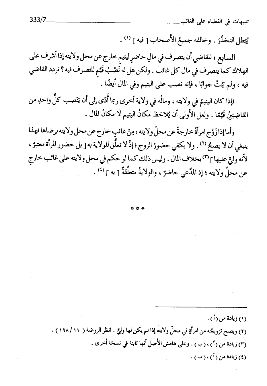 السَّابِع للْقَاضِي أَن يتَصَرَّف فِي مَال حَاضر ليتيم خَارج عَن مَحل ولَايَته إِذا أشرف على الْهَلَاك كَمَا يتَصَرَّف فِي مَال كل غَائِب وَلَكِن هَل لَهُ نصب قيم للتَّصَرُّف فِيهِ تردد القَاضِي فِيهِ وَلم يبت جَوَابا فَإِنَّهُ نصب على الْيَتِيم وَفِي المَال أَيْضا