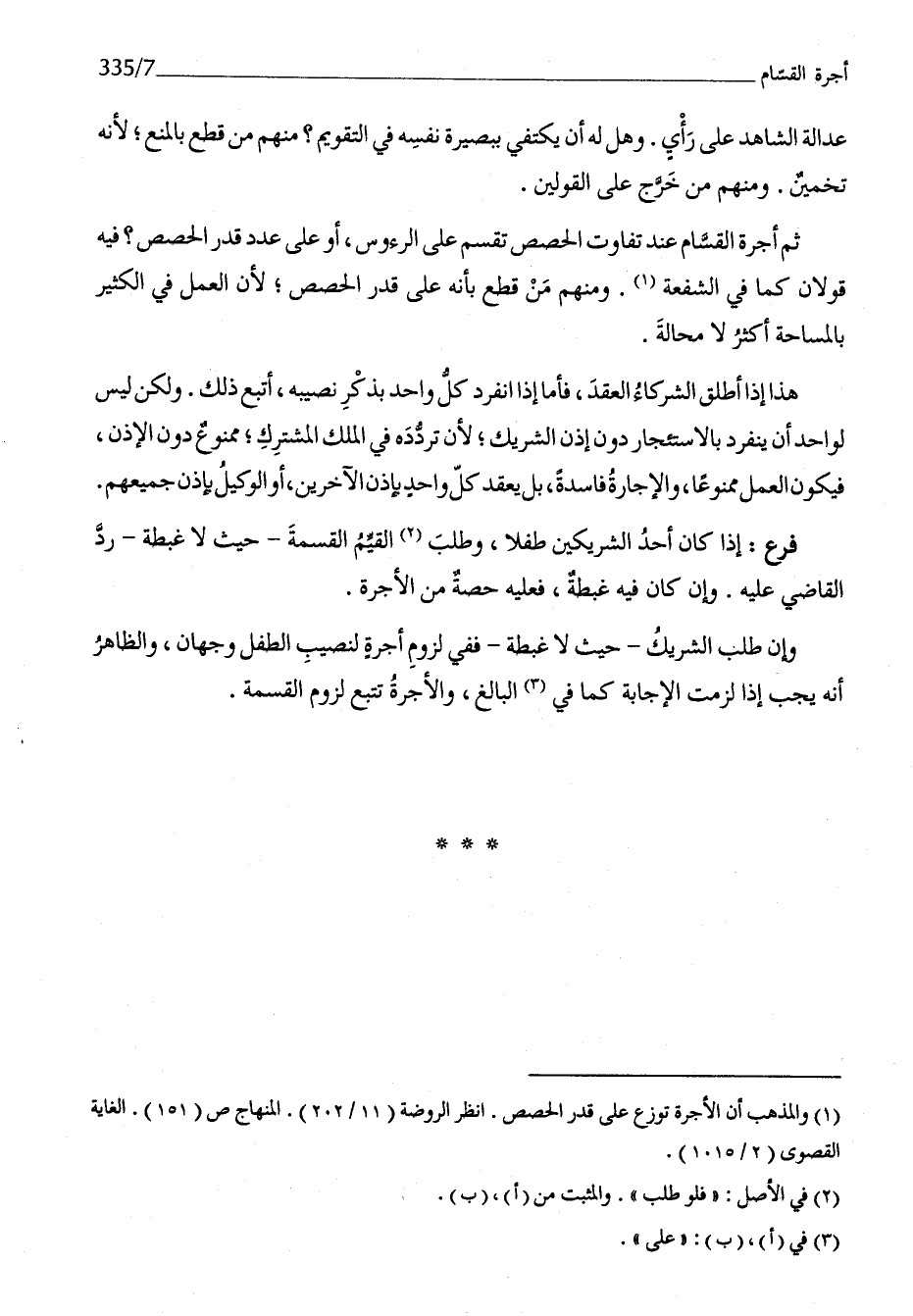 ثمَّ أُجْرَة القسام عِنْد تفَاوت الحصص تقسم على الرُّءُوس أَو على عدد قدر الحصص فِيهِ قَولَانِ كَمَا فِي الشُّفْعَة وَمِنْهُم من قطع بِأَنَّهُ على قدر الحصص لِأَن الْعَمَل فِي الْكثير بالمساحة أَكثر لَا محَالة