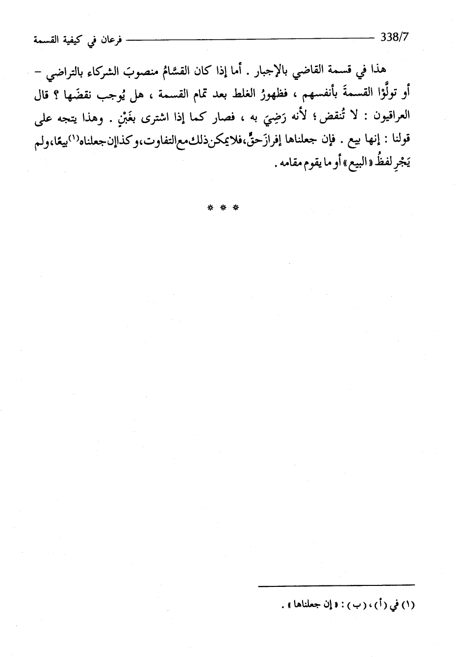 هَذَا فِي قسْمَة القَاضِي بالإجبار أما إِذا كَانَ القسام مَنْصُوب الشُّرَكَاء بِالتَّرَاضِي أَو توَلّوا الْقِسْمَة بِأَنْفسِهِم فظهور الْغَلَط بعد تَمام الْقِسْمَة هَل يُوجب نقضهَا قَالَ الْعِرَاقِيُّونَ لَا تنقض لِأَنَّهُ رَضِي بِهِ فَصَارَ كَمَا إِذا اشْترى بِغَبن وَهَذَا يتَّجه على قَوْلنَا إِنَّهَا بيع فَإِن جعلناها إِفْرَاز حق فَلَا يُمكن ذَلِك مَعَ التَّفَاوُت وَكَذَا إِن جَعَلْنَاهُ بيعا وَلم يجر لفظ البيع أَو مَا يقوم مقَامه
