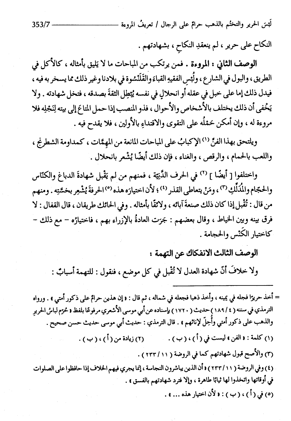 الْوَصْف الثَّانِي الْمُرُوءَة فَمن يرتكب من الْمُبَاحَات مَا لَا يَلِيق بأمثاله كَالْأَكْلِ فِي الطَّرِيق وَالْبَوْل فِي الشَّارِع وَلبس الْفَقِيه القباء والقلنسوة فِي بِلَادنَا وَغير ذَلِك مِمَّا يخسر بِهِ فِيهِ فَيدل ذَلِك إِمَّا على خبل فِي عقله أَو انحلال فِي نَفسه يبطل الثِّقَة بصدقه فتخل شَهَادَته وَلَا يخفى أَن ذَلِك يخْتَلف بالأشخاص وَالْأَحْوَال فذو المنصب إِذا حمل الْمَتَاع إِلَى بَيته لنجله فَلَا مُرُوءَة لَهُ وَإِن أمكن حمله على التَّقْوَى والإقتداء بالأولين فَلَا يقْدَح فِيهِ