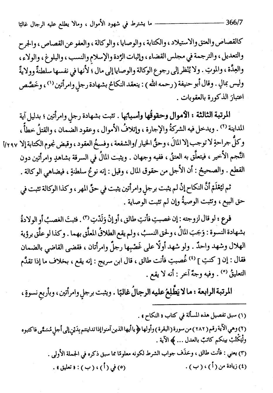 الْمرتبَة الثَّالِثَة الْأَمْوَال وحقوقها وأسبابها تثبت بِشَهَادَة رجل وَامْرَأَتَيْنِ بِدَلِيل آيَة المداينة وَيدخل فِيهِ الشّركَة وَالْإِجَارَة وَإِتْلَاف الْأَمْوَال وعقود الضَّمَان وَالْقَتْل خطأ وكل جِرَاحَة لَا توجب إِلَّا المَال وَحقّ الْخِيَار وَالشُّفْعَة وَفسخ الْعُقُود وَقبض نُجُوم الْكِتَابَة إِلَّا النَّجْم الْأَخير فَيتَعَلَّق بِهِ الْعتْق فَفِيهِ وَجْهَان وَيثبت المَال فِي السّرقَة بِشَاهِد وَامْرَأَتَيْنِ دون الْقطع وَالصَّحِيح أَن الْأَجَل من حُقُوق المَال وَقيل إِنَّه نوع سلطنة فيضاهي الْوكَالَة