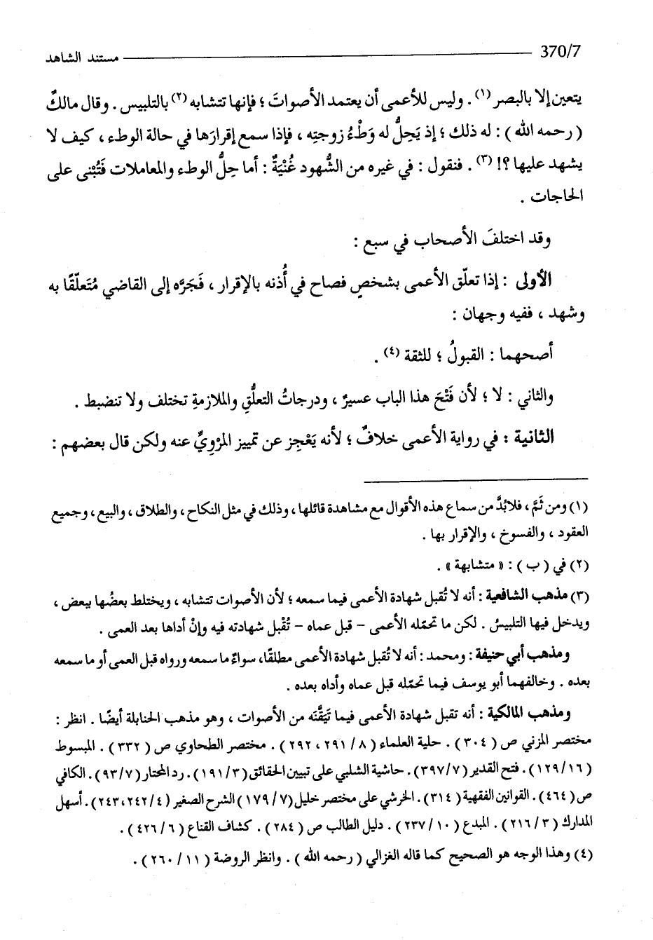 يتَعَيَّن إِلَّا بالبصر وَلَيْسَ للأعمى أَن يعْتَمد الْأَصْوَات فَإِنَّهَا تتشابه بالتلبيس وَقَالَ مَالك رَحمَه الله لَهُ ذَلِك إِذْ يحل لَهُ وَطْء زَوجته فَإِذا سمع إِقْرَارهَا فِي حَالَة الْوَطْء كَيفَ لَا يشْهد عَلَيْهَا فَنَقُول فِي غَيره من الشُّهُود غنية أما حل الْوَطْء والمعاملات فتبنى على الْحَاجَات