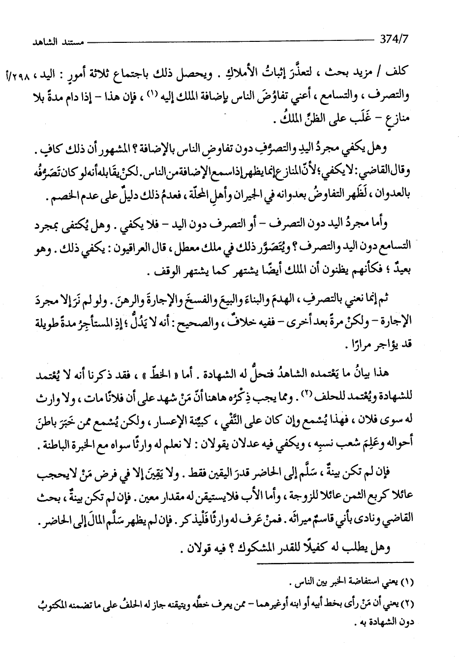 كلف مزِيد بحث لتعذر إِثْبَات الأملالك وَيحصل ذَلِك باجتماع ثَلَاثَة أُمُور الْيَد وَالتَّصَرُّف والستامع أَعنِي تفاوض النَّاس بِإِضَافَة الْملك إِلَيْهِ فَإِن هَذَا إِذا دَامَ مُدَّة بِلَا مُنَازع غلب على الظَّن الْملك